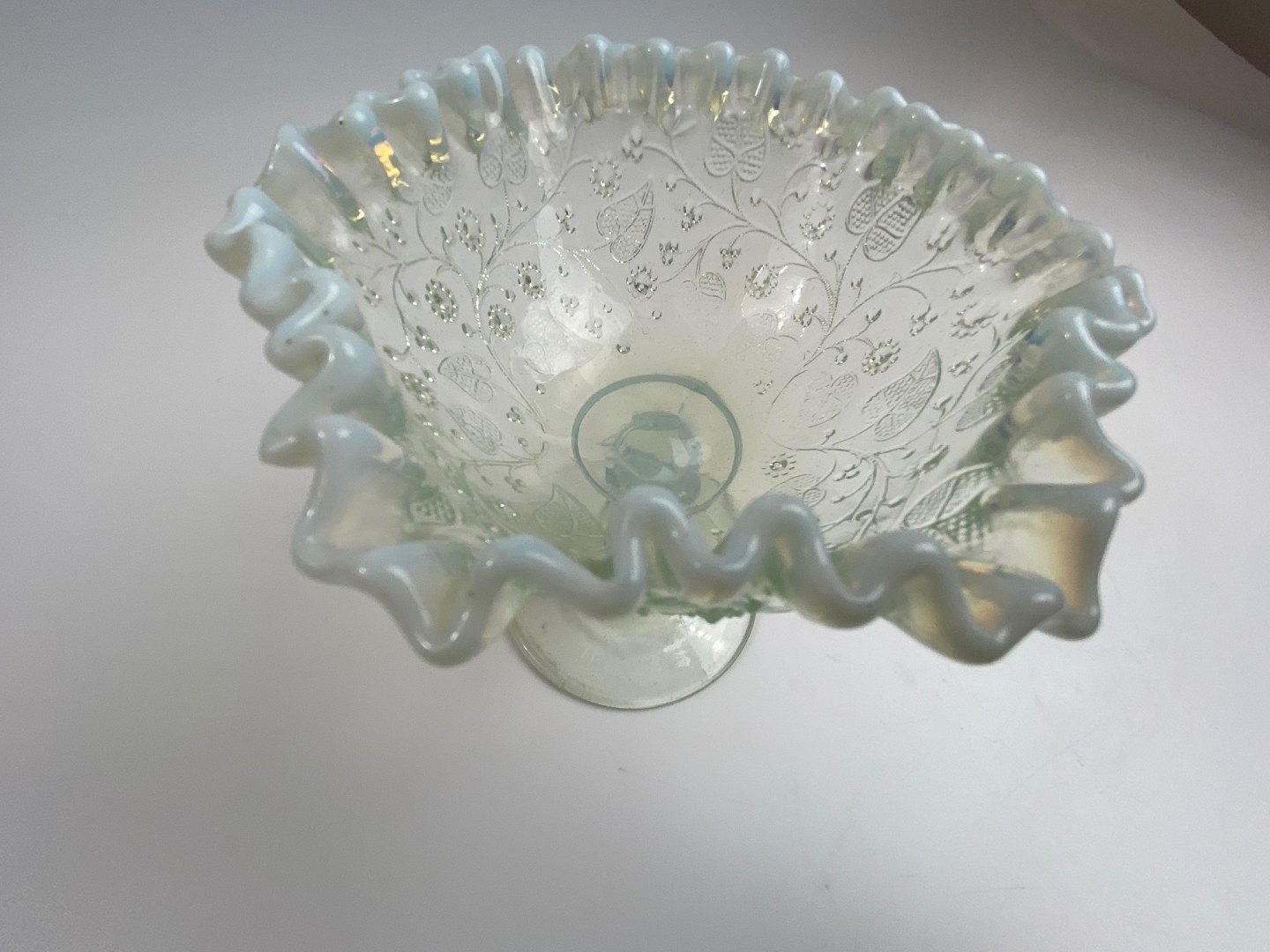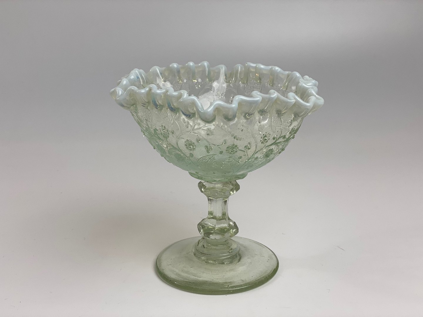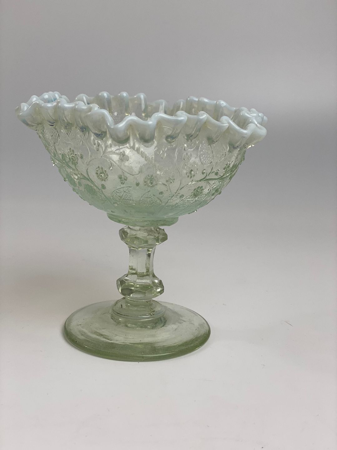 Smukt, gammelt sukkerfad / sukkerskål af klart glas med flæset kant i hvidt glas. Dekoration af blade og blomster.