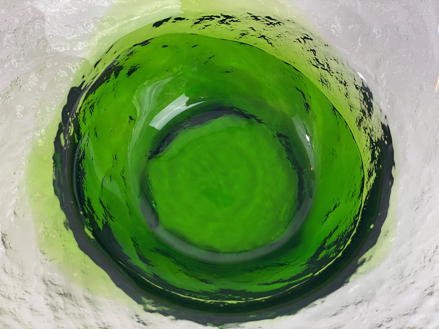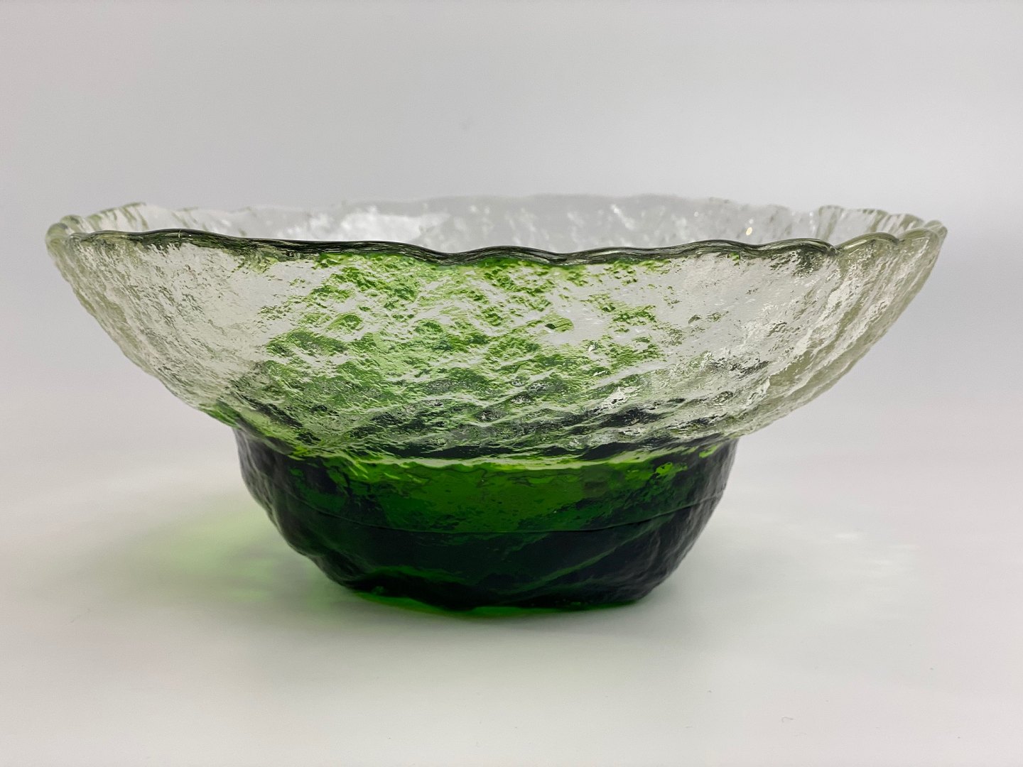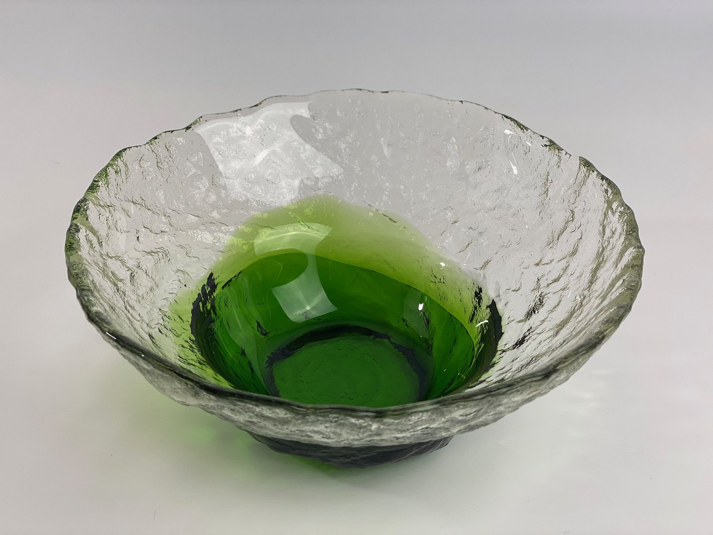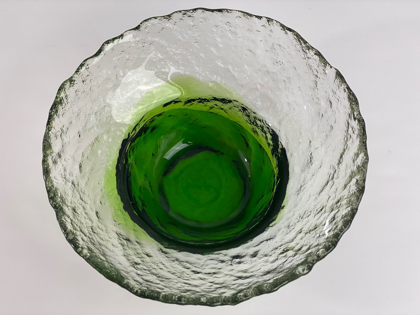 Glasskål med is-effekt af Pertti Santalahti for finske Humppila glasværk i 1970'erne. Skålen har en smuk grøn farve i bunden, mens den øverste del er af klart glas. Skålen er signeret "Pertti Santalahti".