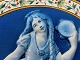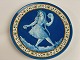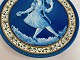 Fransk fajance tallerken / platte med motiv af blå pige med lange fletninger i relief. Pigen danser og spiller musik med kastagnetter og tamburin, første halvdel af det 20. århundrede