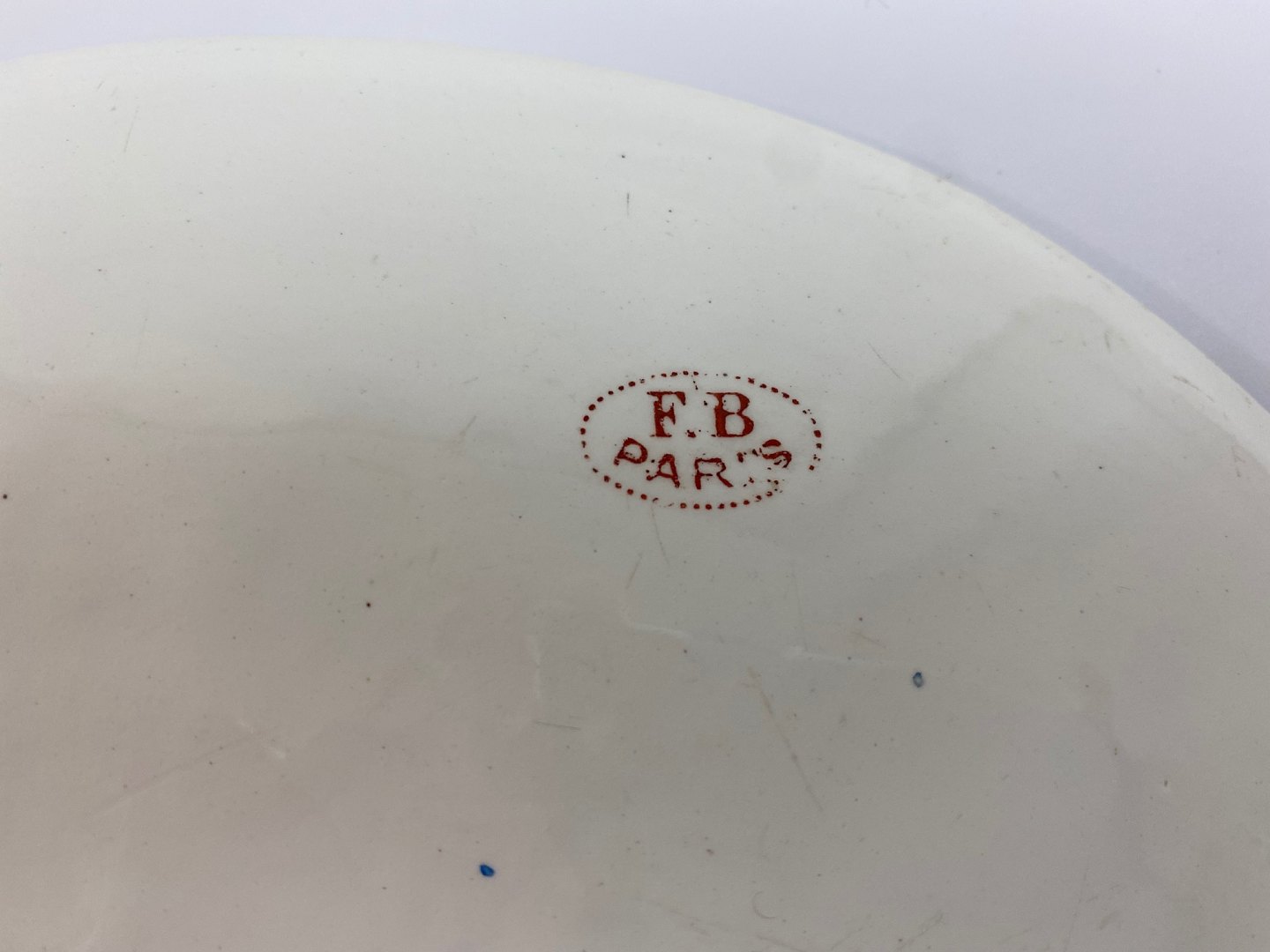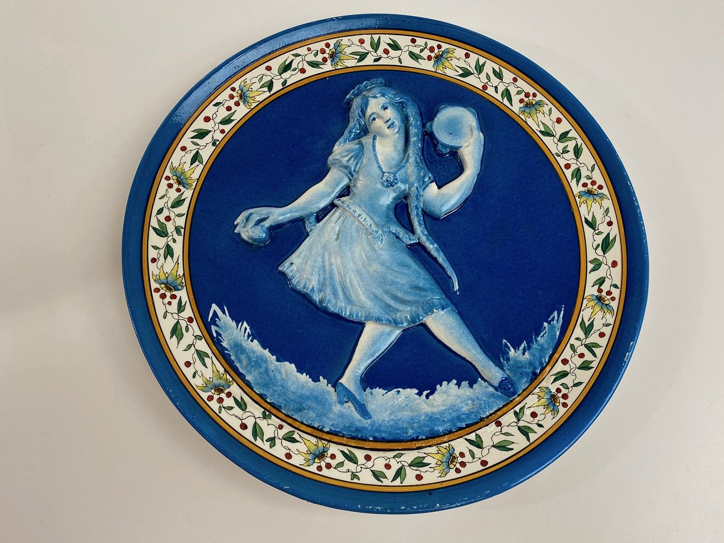 Fransk platte / fajancetallerken til ophæng på væg i relief med motiv af dansende og musicerende pige med kastagnetter og tamburin. Pigen har langt hår med fletninger og krans på hovedet og danser på en græsplæne eller skovbund. Tallerkenen er mærket F.B. Paris.