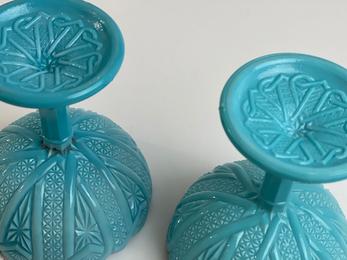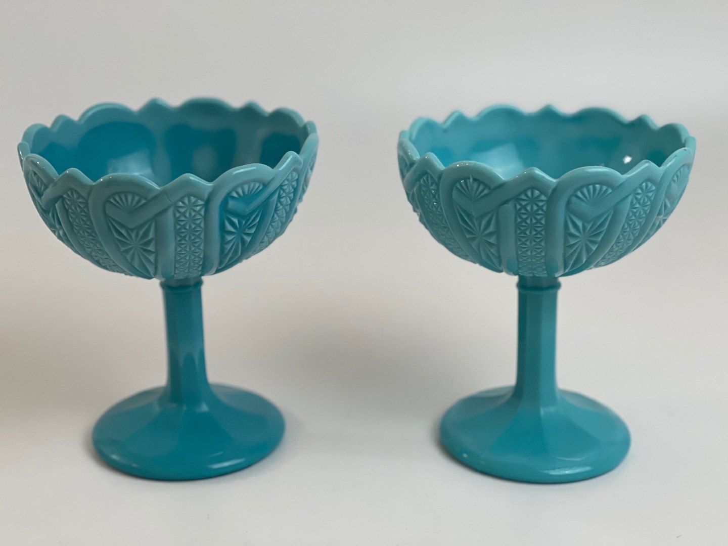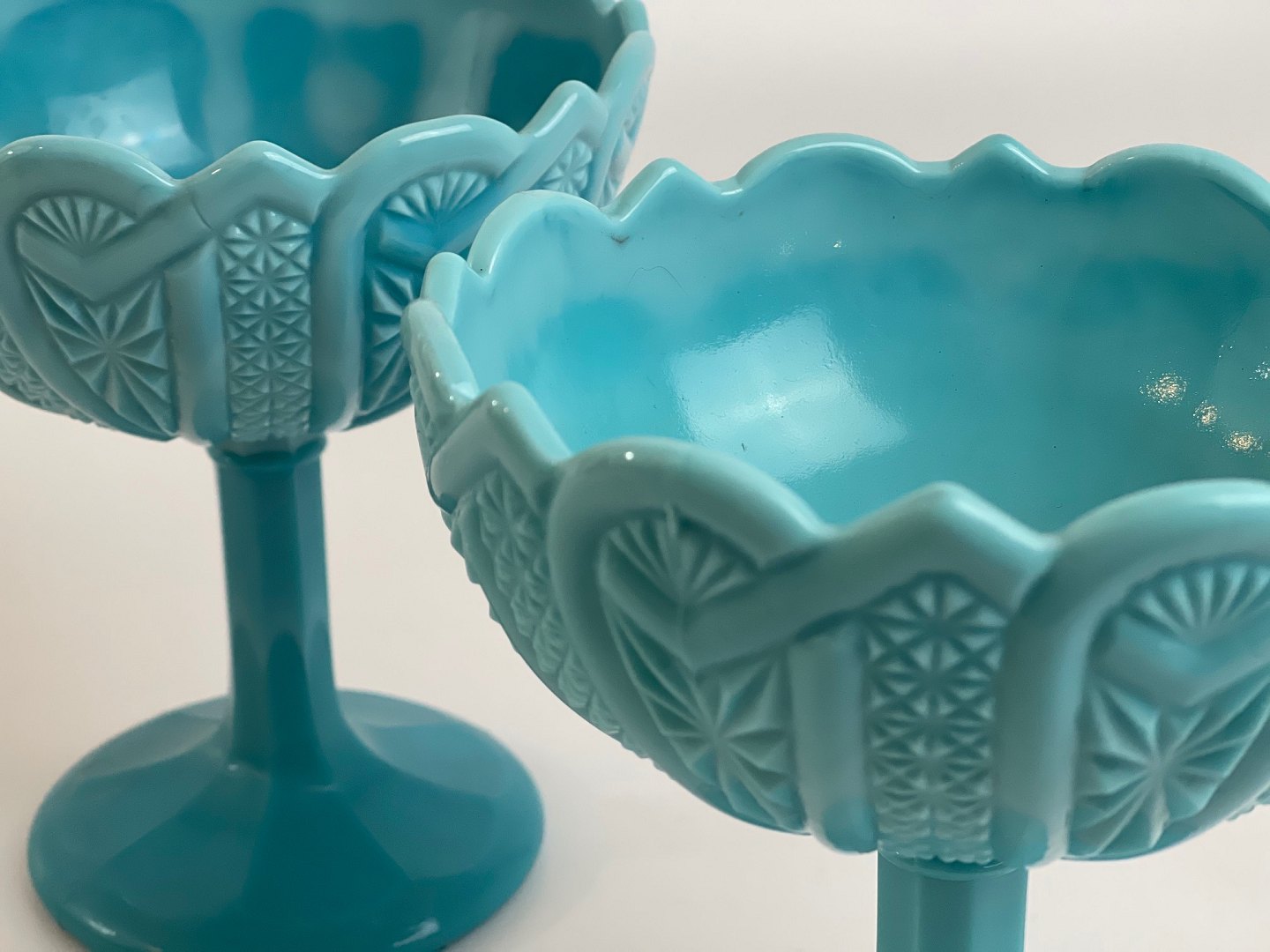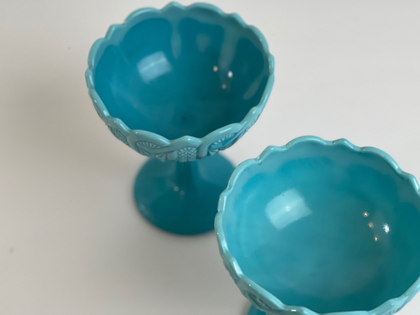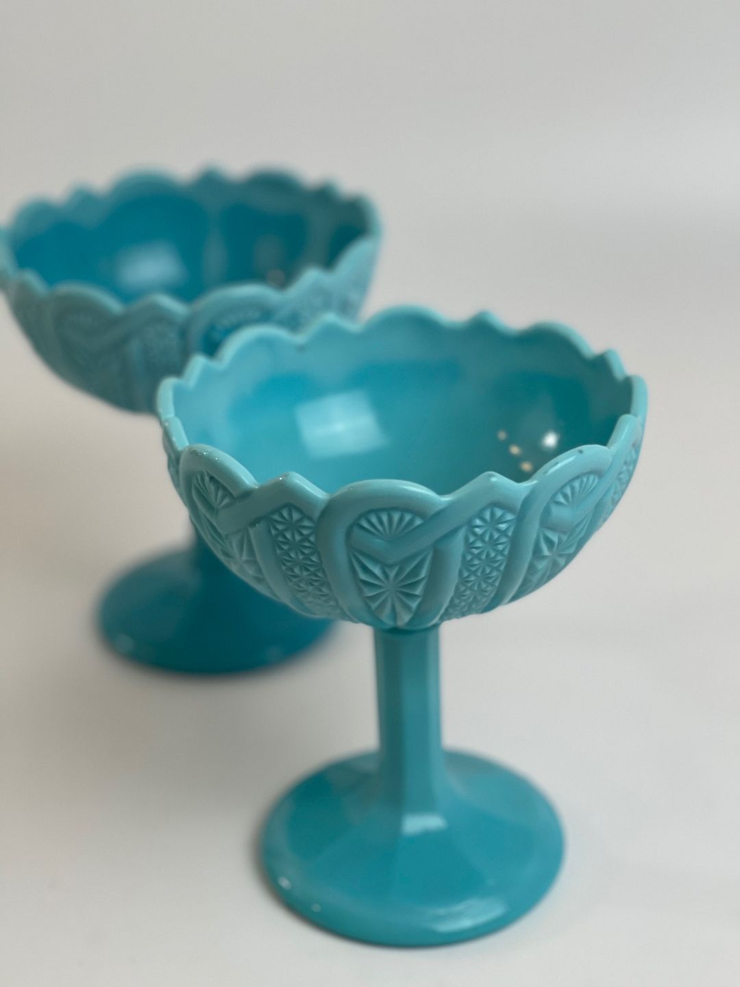 Turkis / lyseblå glasskål på fod af presset mælkeglas. Skålene er lavet af presset glas og er cirka 16 centimeter høje.