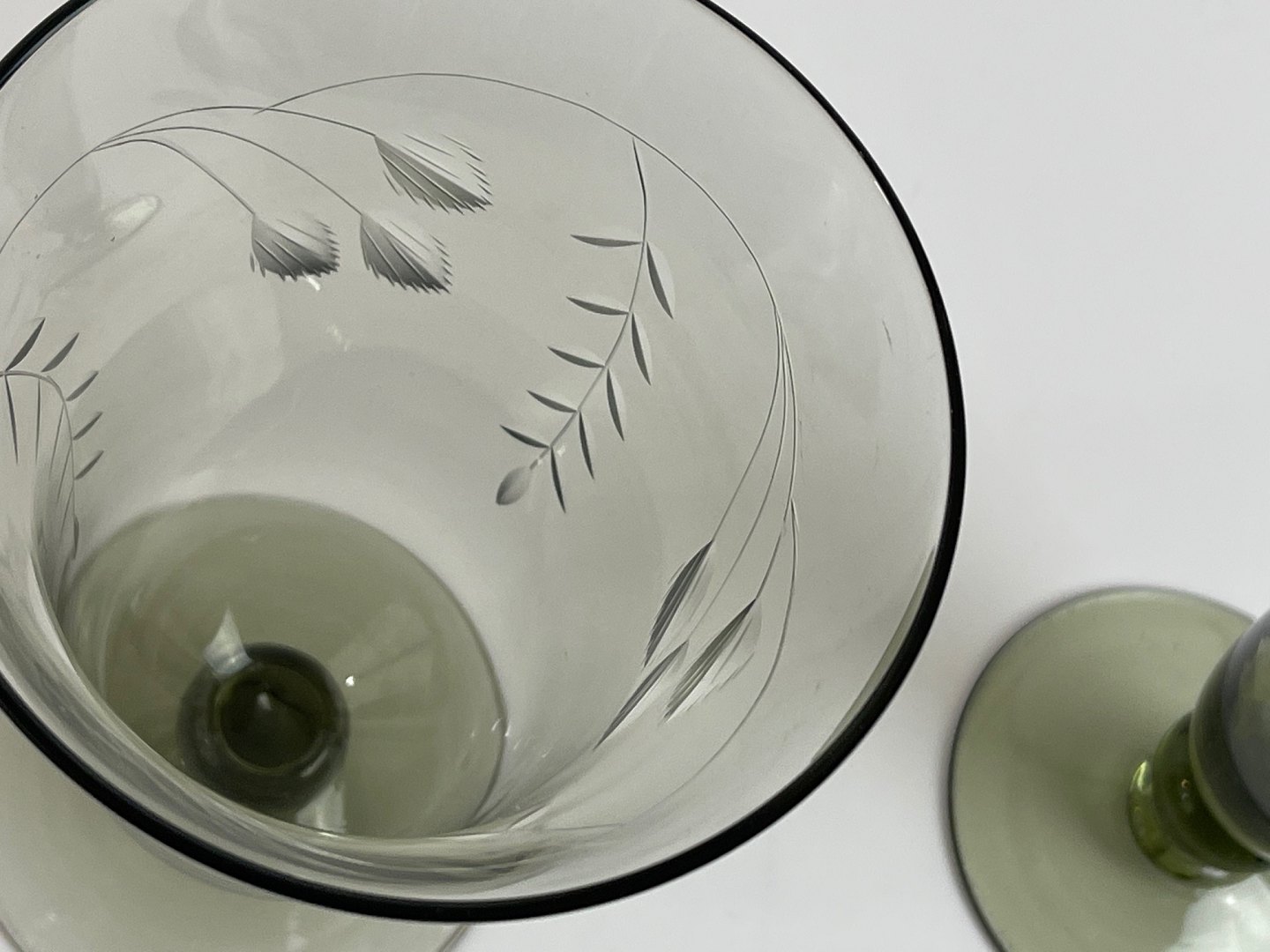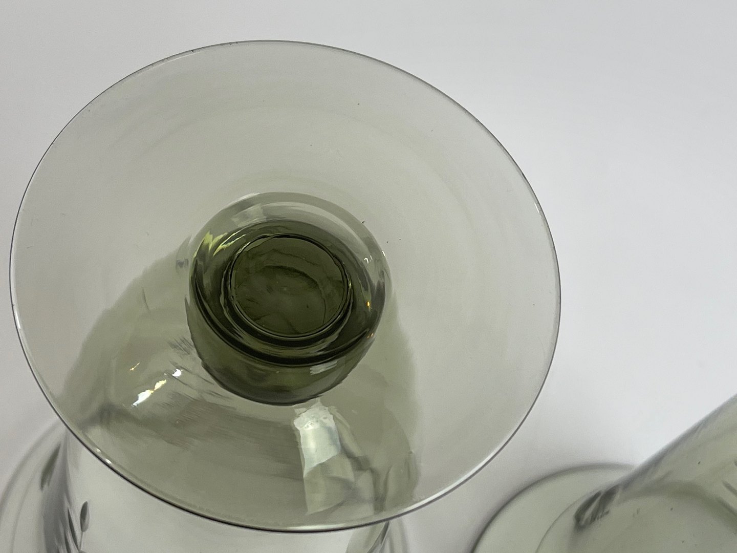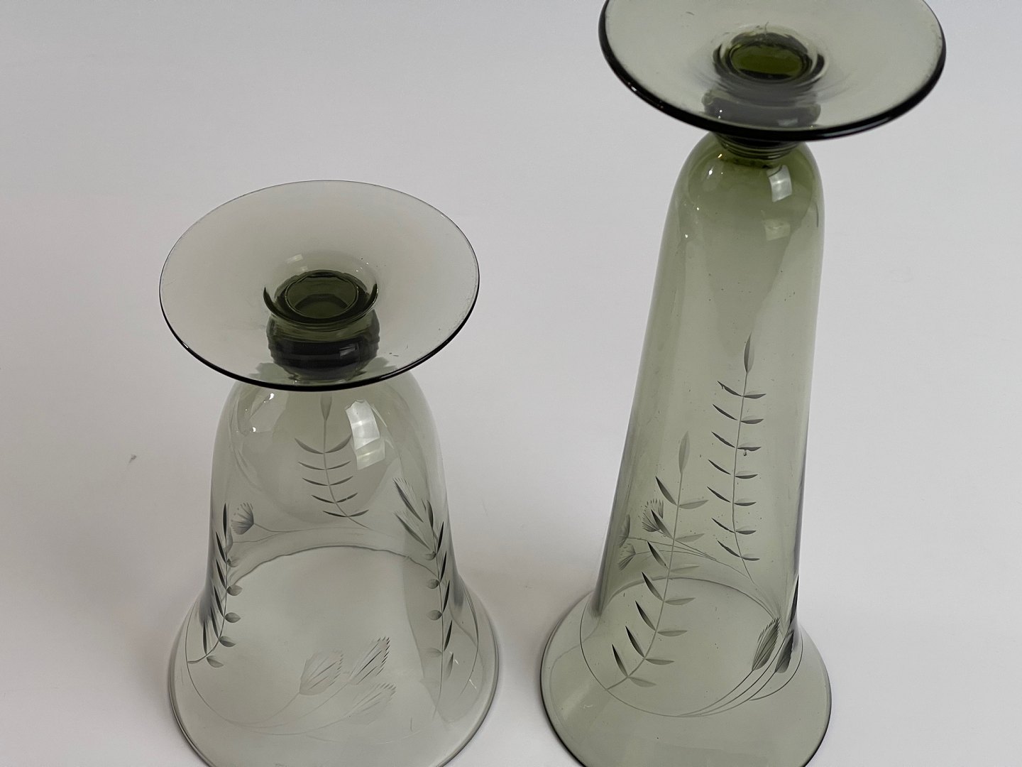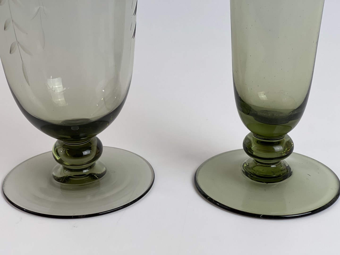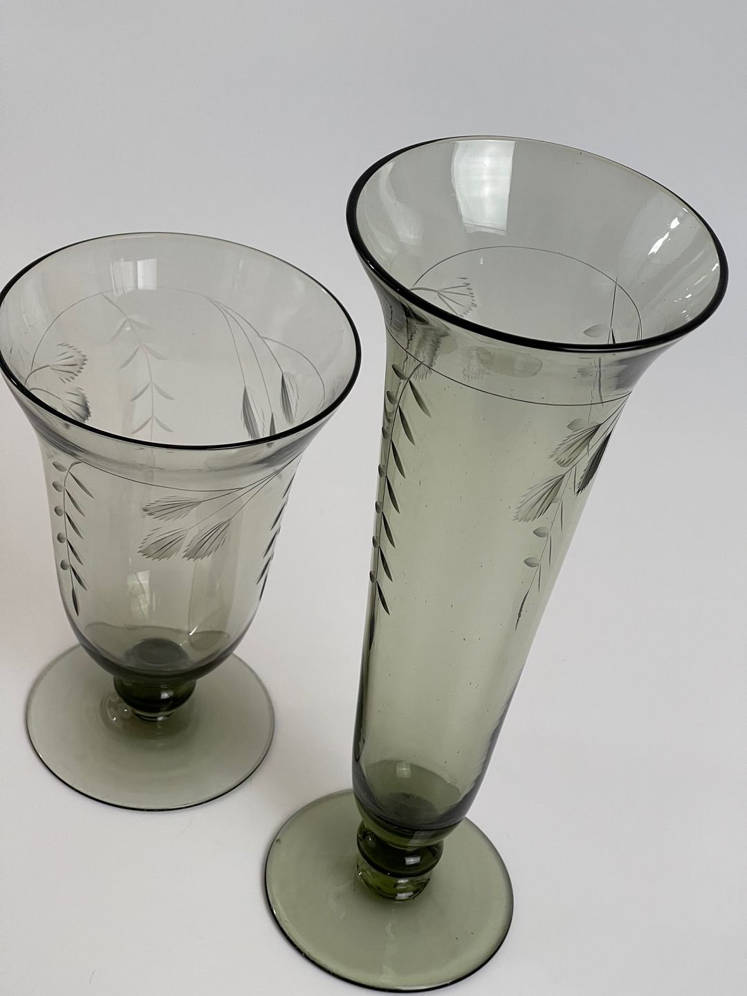 Par art deco glasvaser med slebet dekoration af bladranker i farven røgtopas med grønt skær. Vaserne er i Swedish Grace-stilen, men stammer formentlig fra danske Holmegaard.
