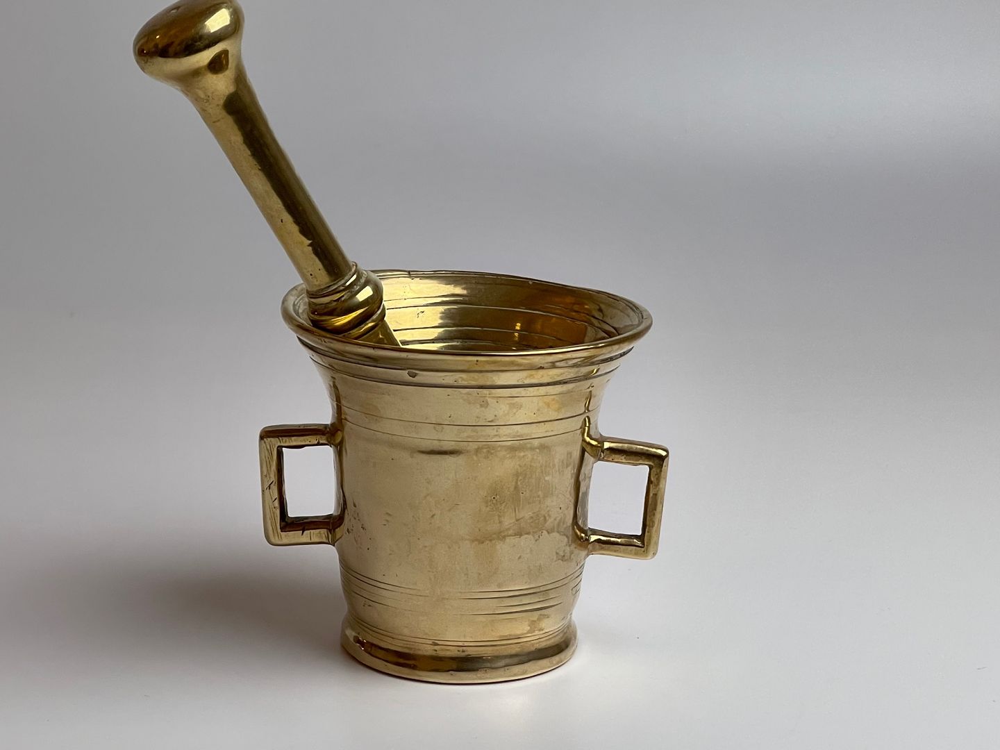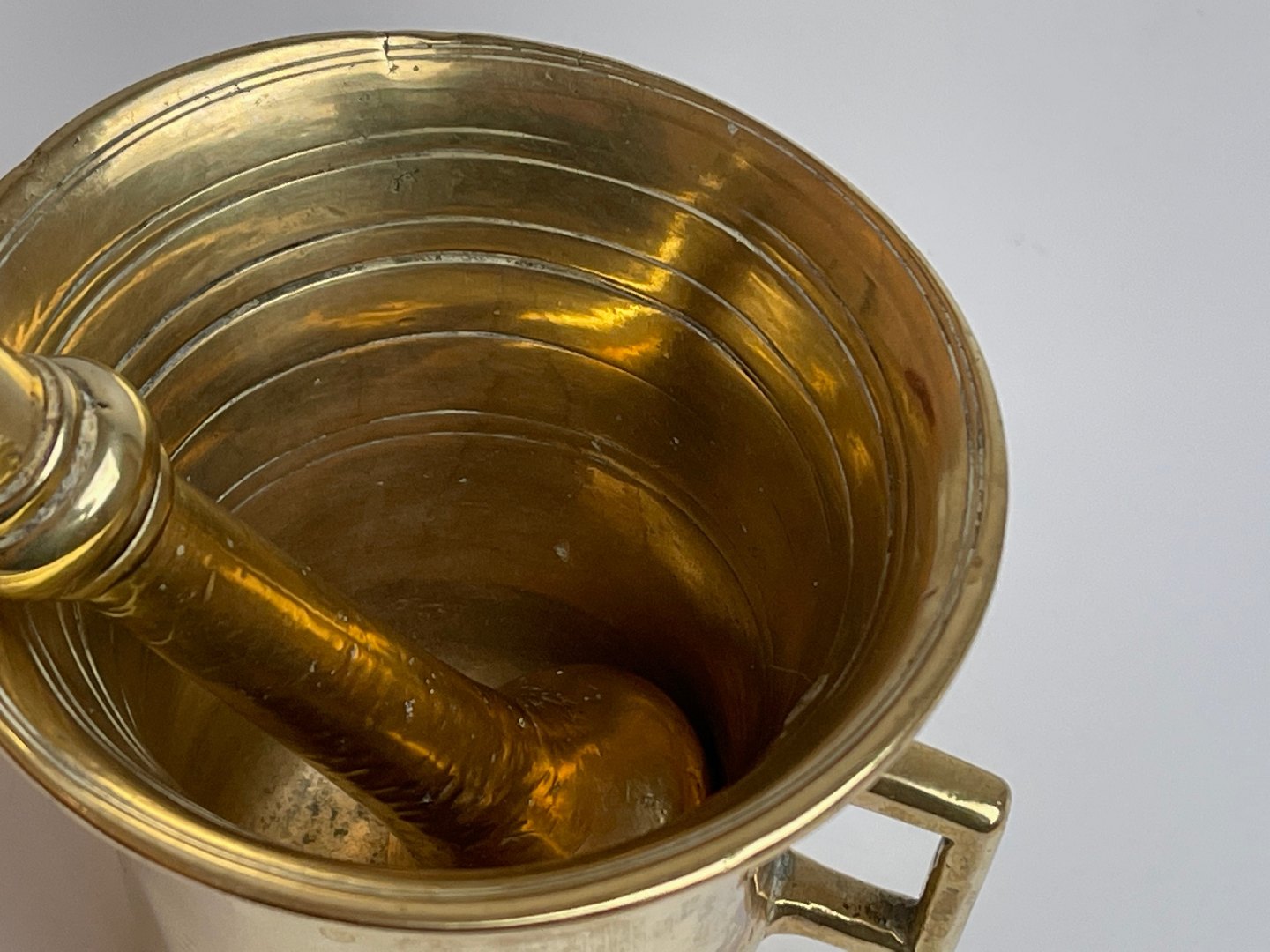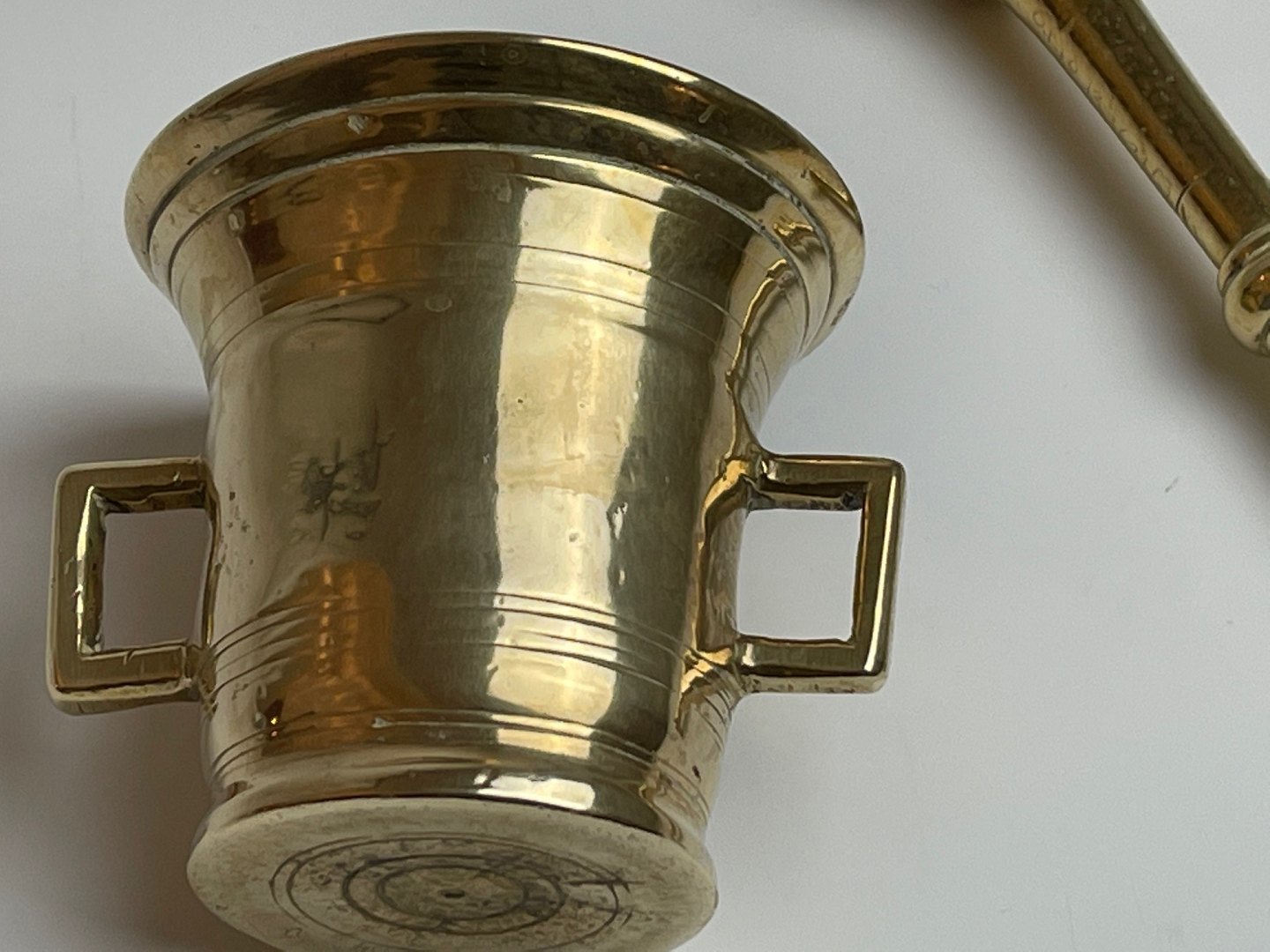 Fin, antik morter af messing med pistil. Både morteren og pistil'en bærer samme stempel, så man kan se, de hører sammen.