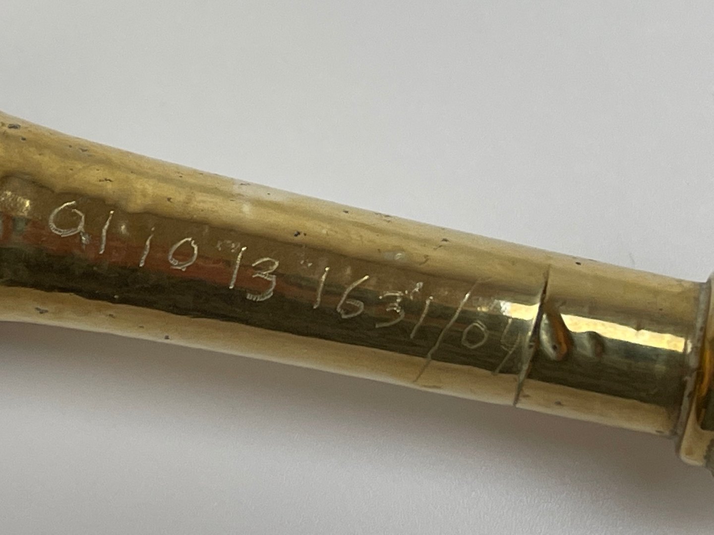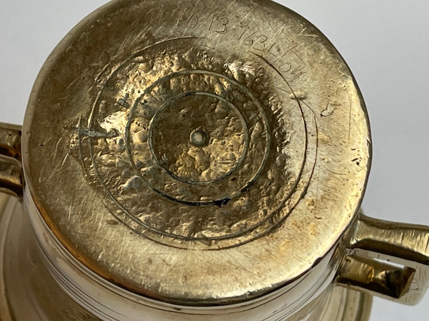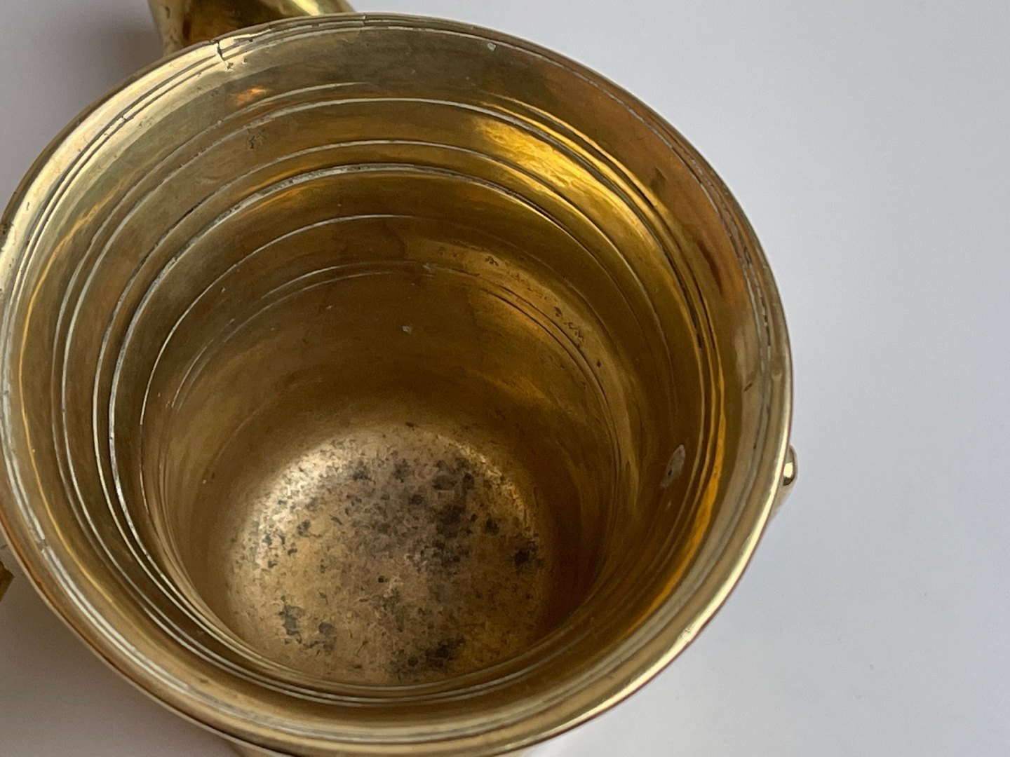 Fin, antik morter af messing med pistil. Både morteren og pistil'en bærer samme stempel, så man kan se, de hører sammen.