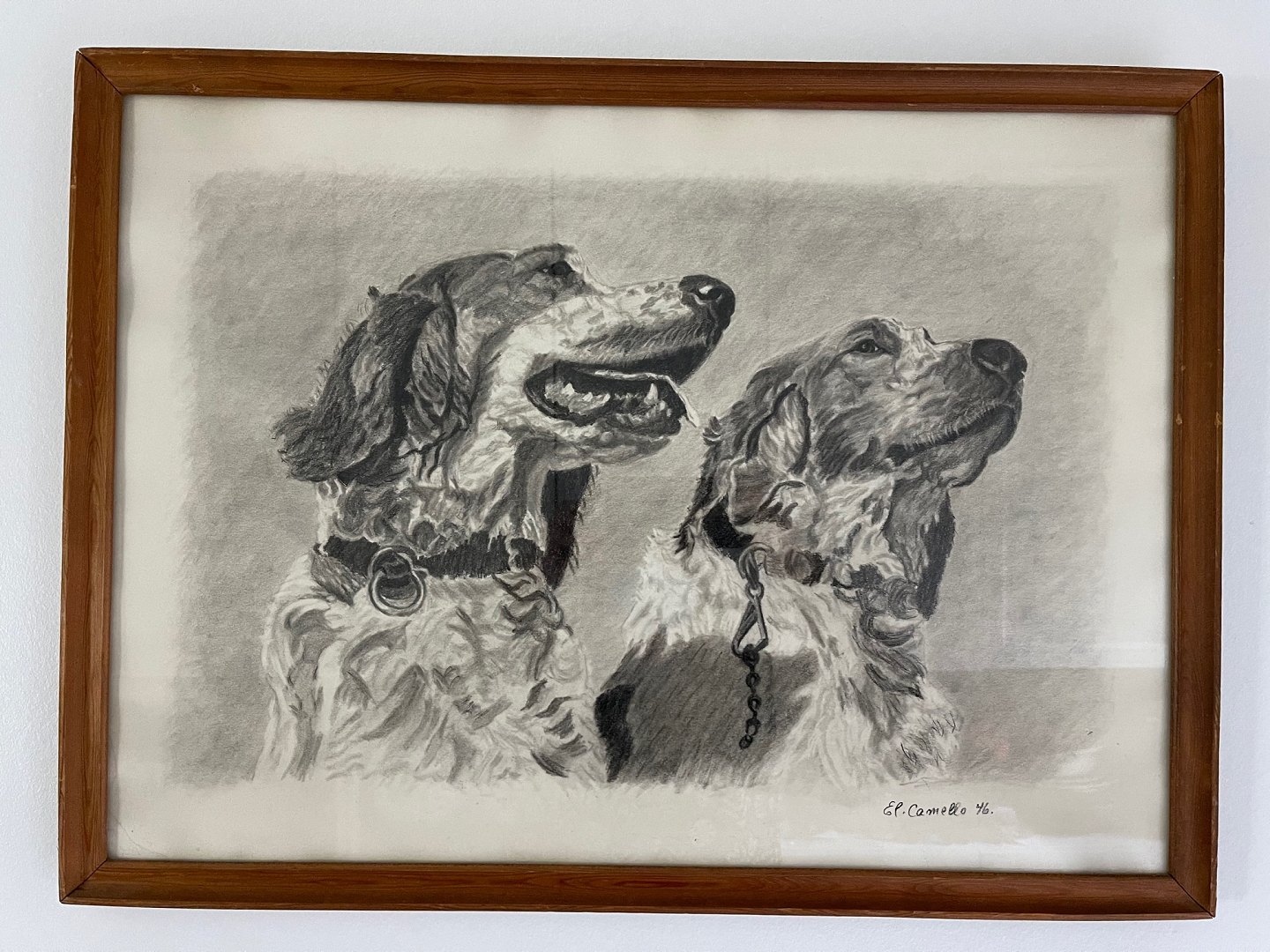 Tegning af to hunde bag glas i fyrretræsramme. Tegningen er signeret El. Camello 46.
