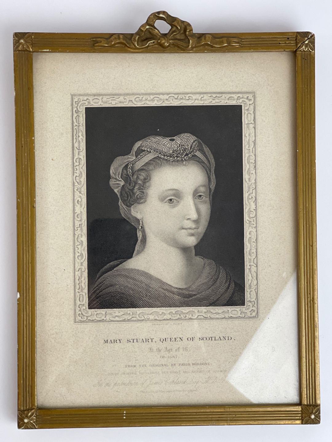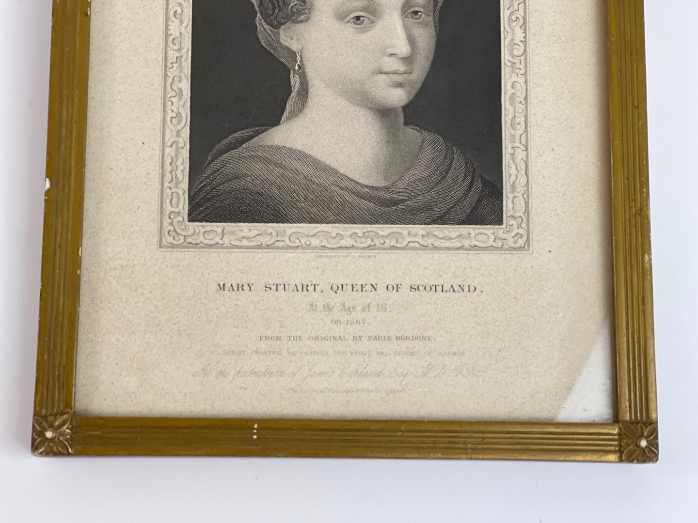 "ENGRAVED BY J. PARKIN."; nederst midt for: "MARY STUART, QUEEN OF SCOTLAND. / At the Age of 16. / OB: 1587 / FROM THE ORIGINAL BY PARIS BORDONE. / COURT PAINTER TO FRANCIS THE FIRST AND SECOND OF FRANCE / In the possession of James Copland, Esq: M.D. FRS. / (The Frame is also copied from the Original)"