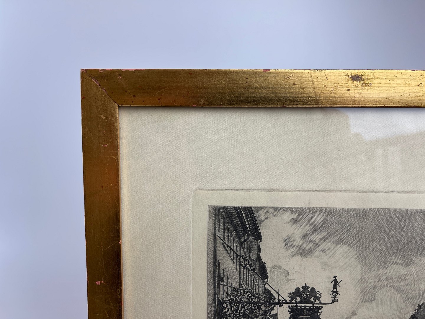 Smuk, gammel guldramme med patina med radering af Peter Tom-Petersen fra Adelgade i København: "Adelgade med tømrerskiltet". Raderingen er usigneret, og der er formentligt tale om et prøvetryk. Du kan se den signerede udgave her: https://petertom-petersen.dk/side-2.html (se under nr. 39).