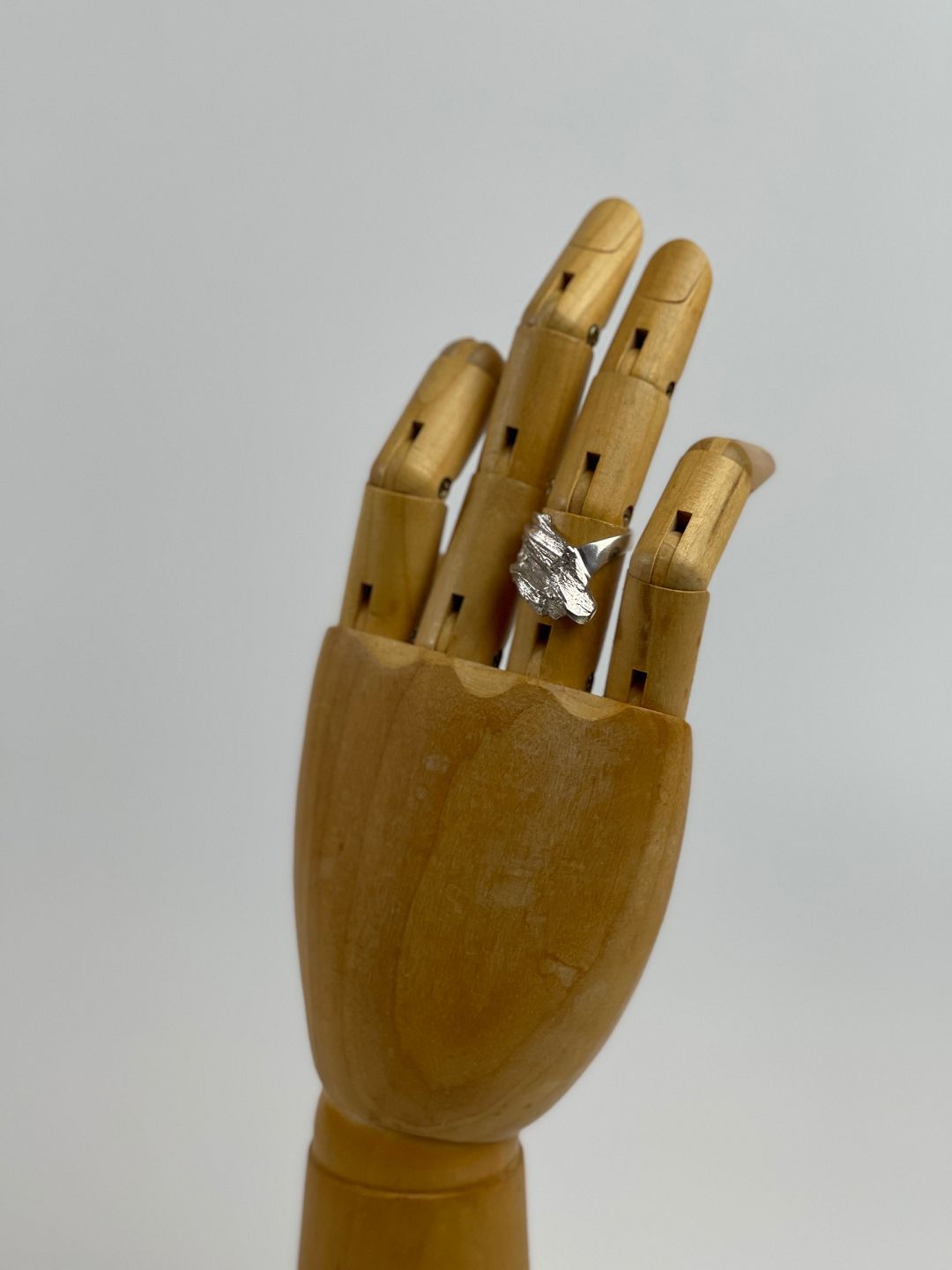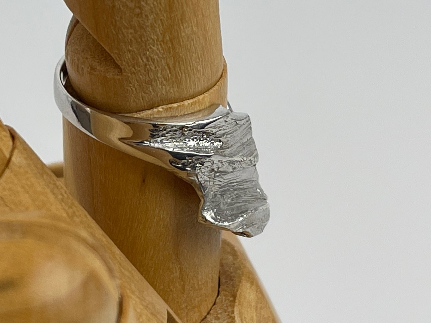 Modernistisk udformet sølvring, ubrugt, designet, så den går lidt op over fingeren og næsten rammer knoen. Størrelse 55,50.