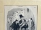 Tryk/litografi fra 1840'erne. Kunstner Honoré Daumier fra serien Le Papas, motiv nr. 13 af far, som bærer sit barn, der har ondt i maven, gennem byen. Signeret i trykket. Trykt hos Chez Aubert, Pl. de la Bourse I 1840'erne i Frankrig. Tekst: Allons bon.....v'la p'tit qui dit qu'il a bobo au ventre!.....