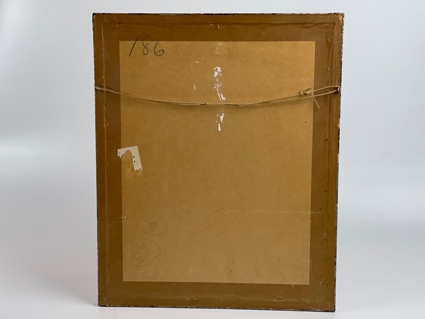 Gammel indramning i træramme sølv/guld. Rammens ydermål: 37 x 46 centimeter. Lysåbning til print: ca. 23 x 30 centimeter. Kan købes som beset med indramningen intakt - eller kan tages ud af rammen og undersøges nærmere. Prisen er den samme uanset om rammen er med eller ej, men rammen kan ikke købes uden trykket.