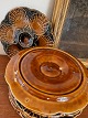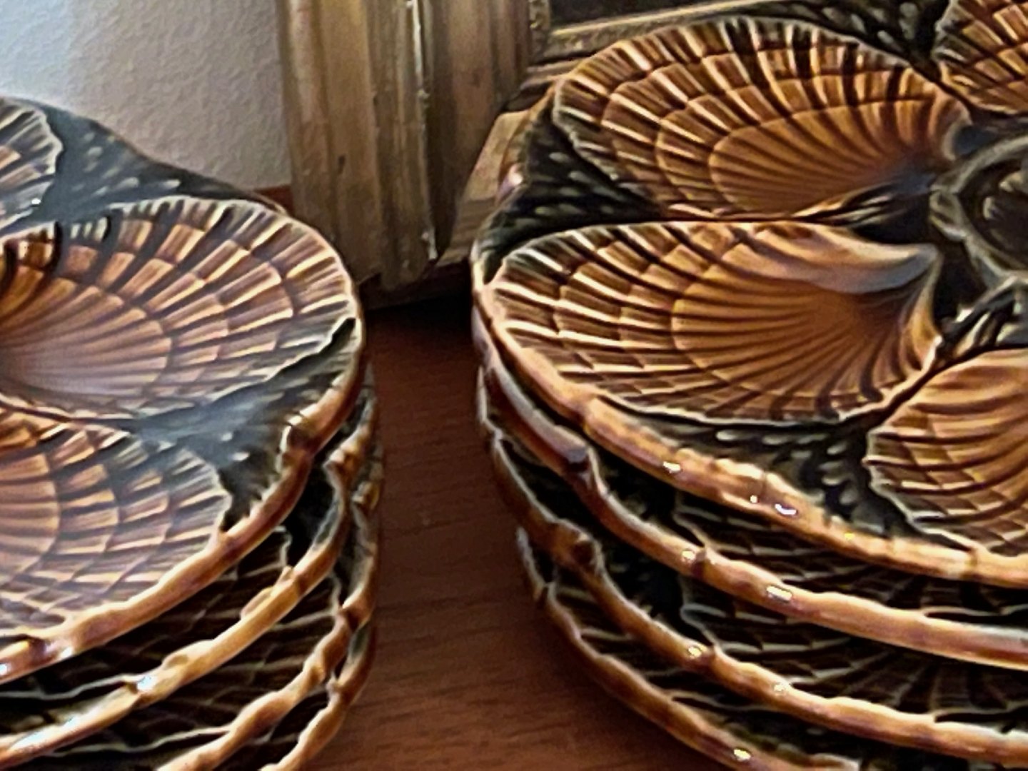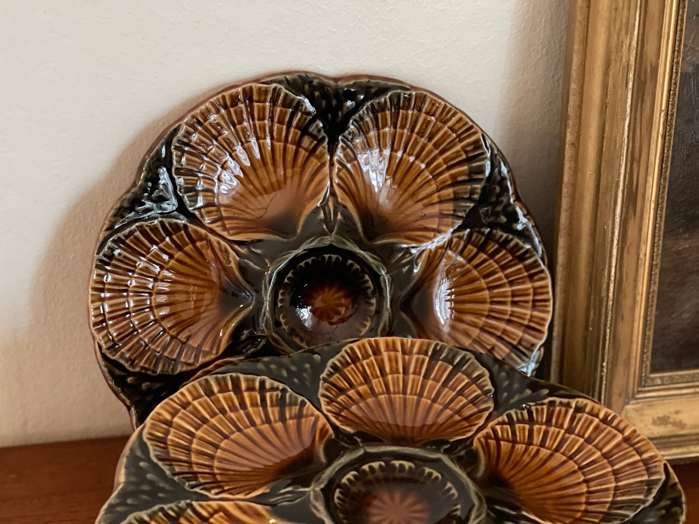 Sarreguemines - franske østerstallerkener i tofarvet majolica-lignende glasur, brun og koksgrå