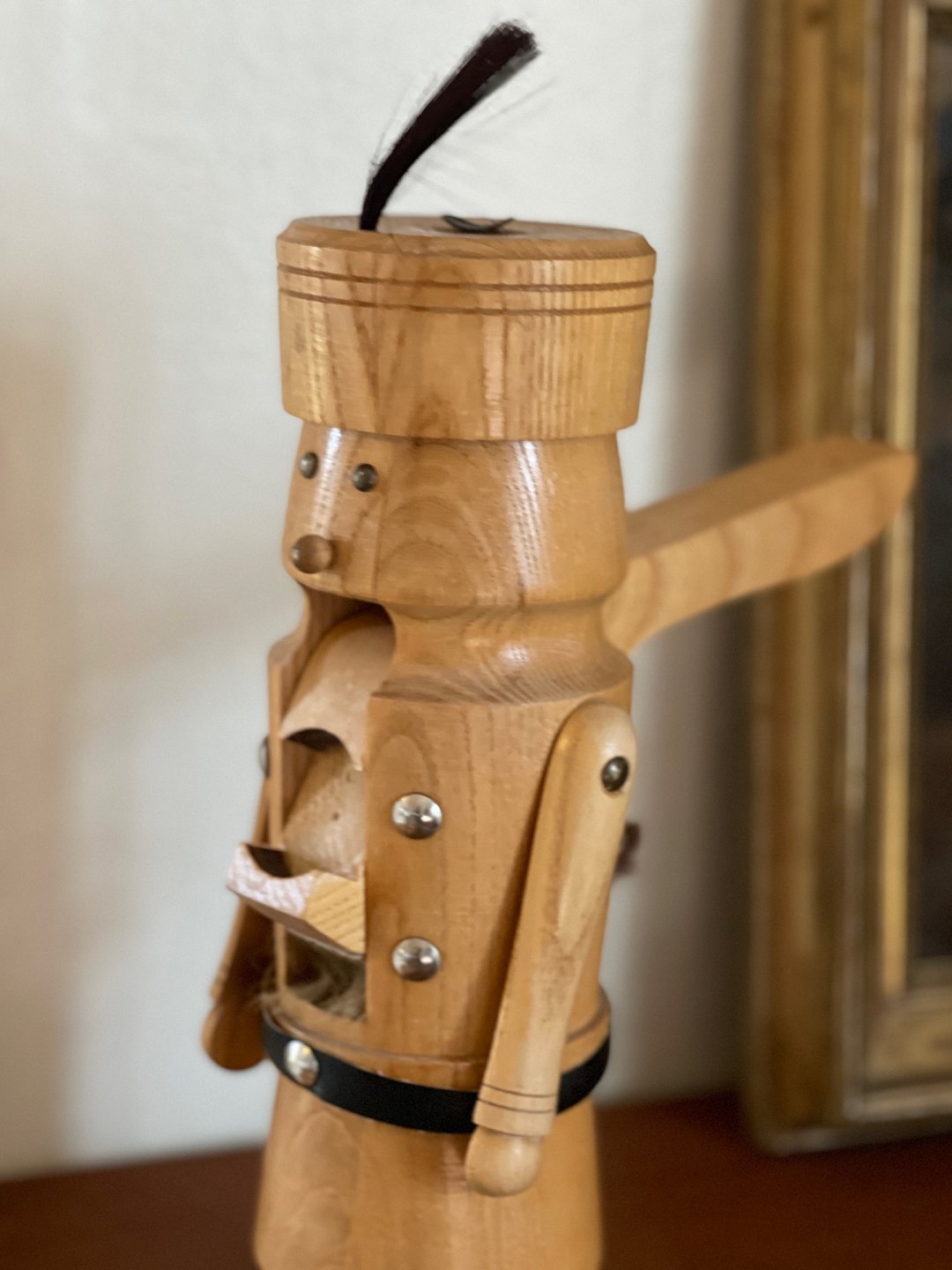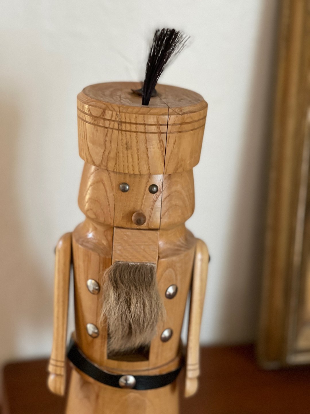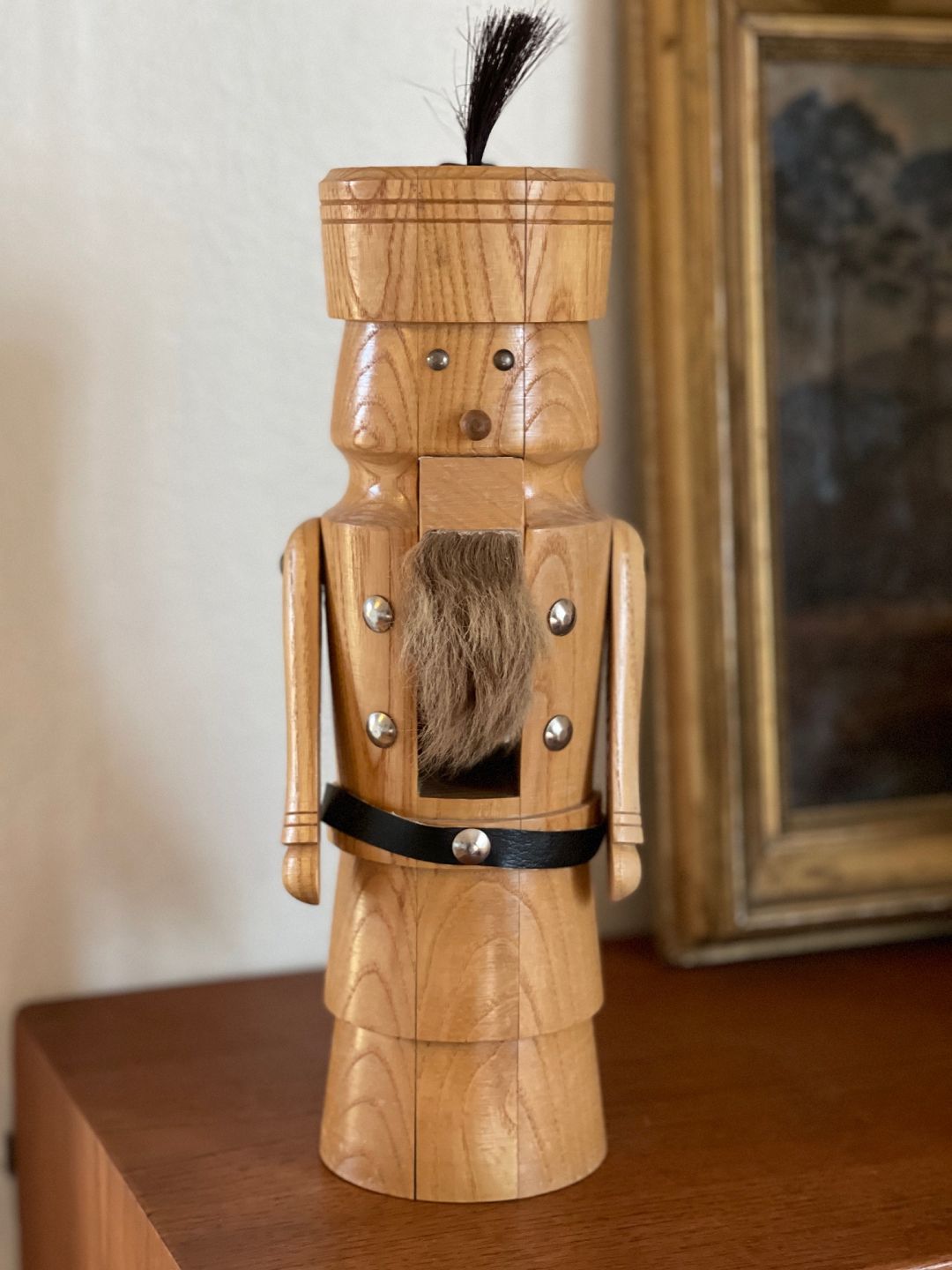 Vintage nøddeknækker af stavlimet træ. Nøddeknækkeren er udformet som en soldat med skæg.