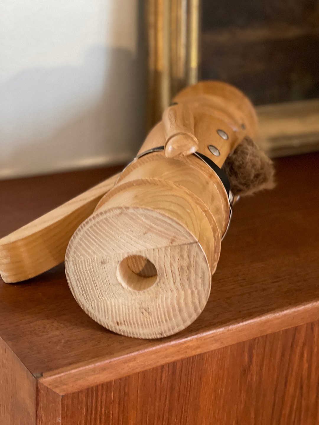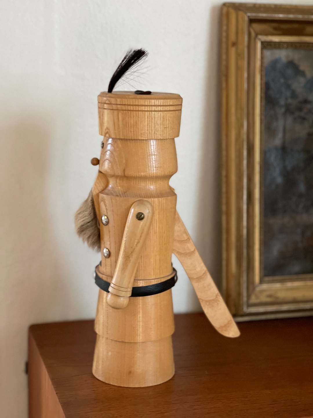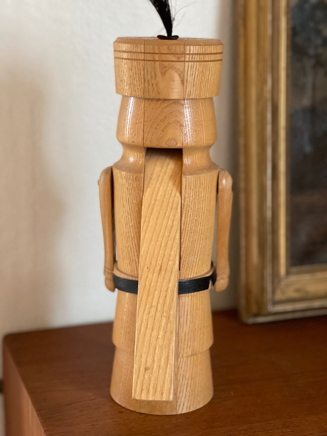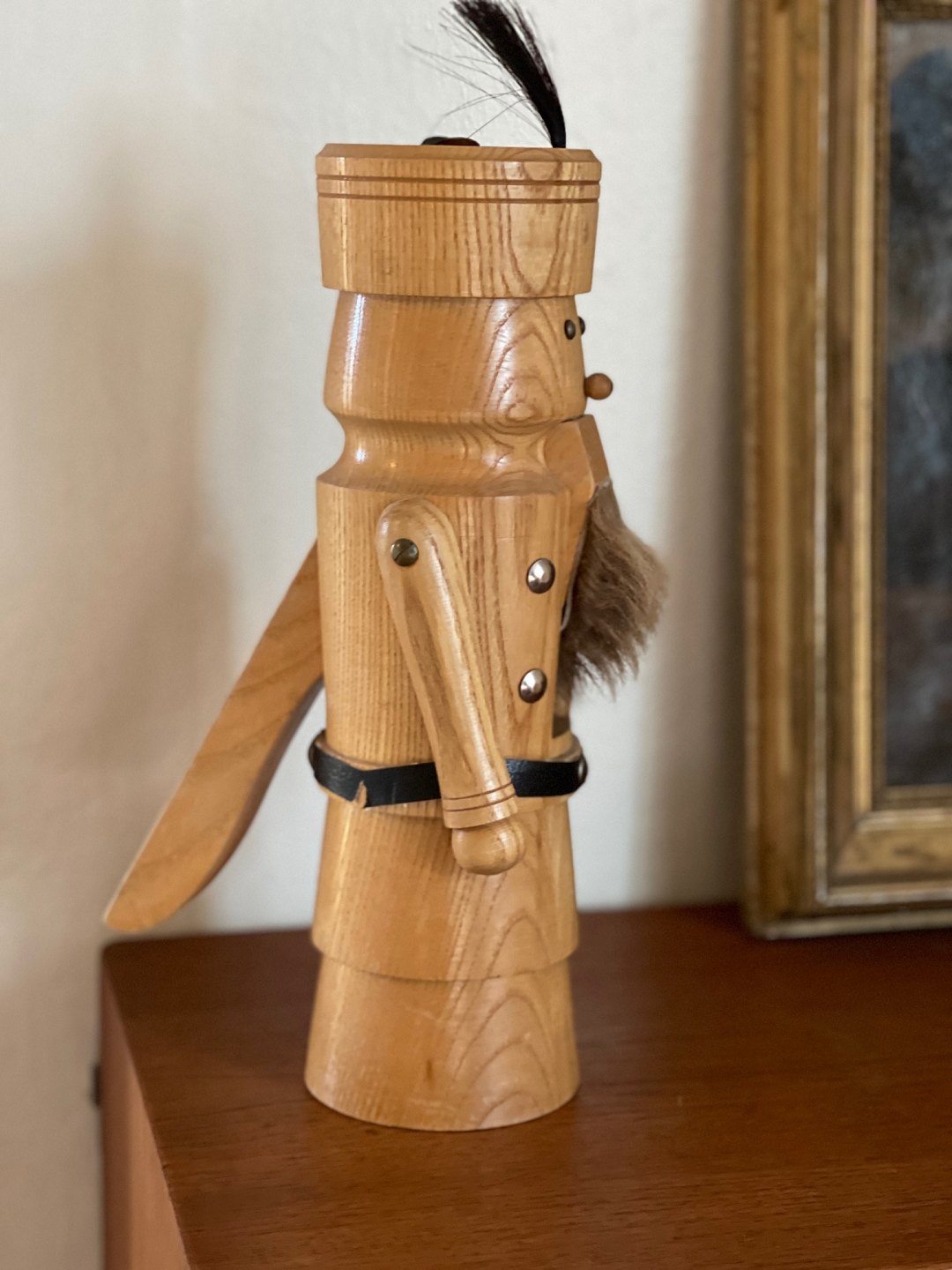 Vintage nøddeknækker af stavlimet træ. Nøddeknækkeren er udformet som en soldat med skæg.