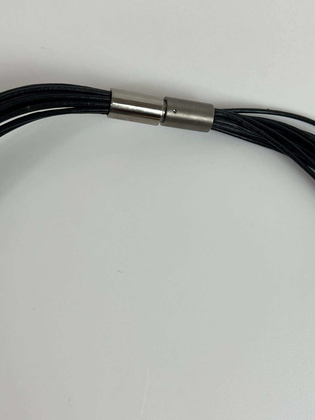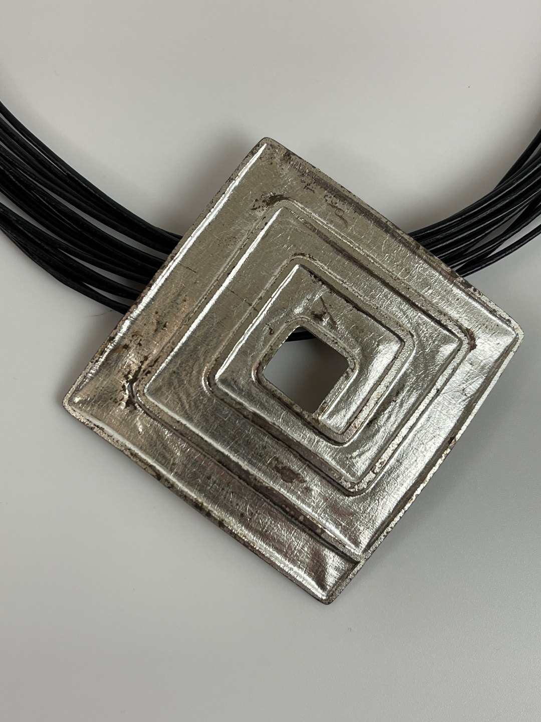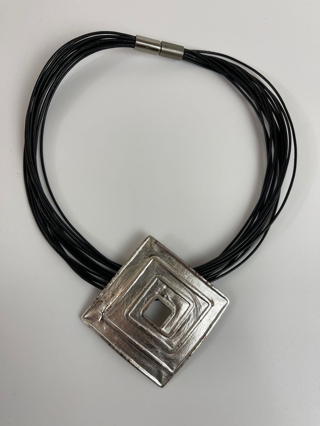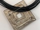 Stort vedhæng i sterlingsølv / broche i 14-radet læderhalskæde med lås af metal (antageligt stål).
