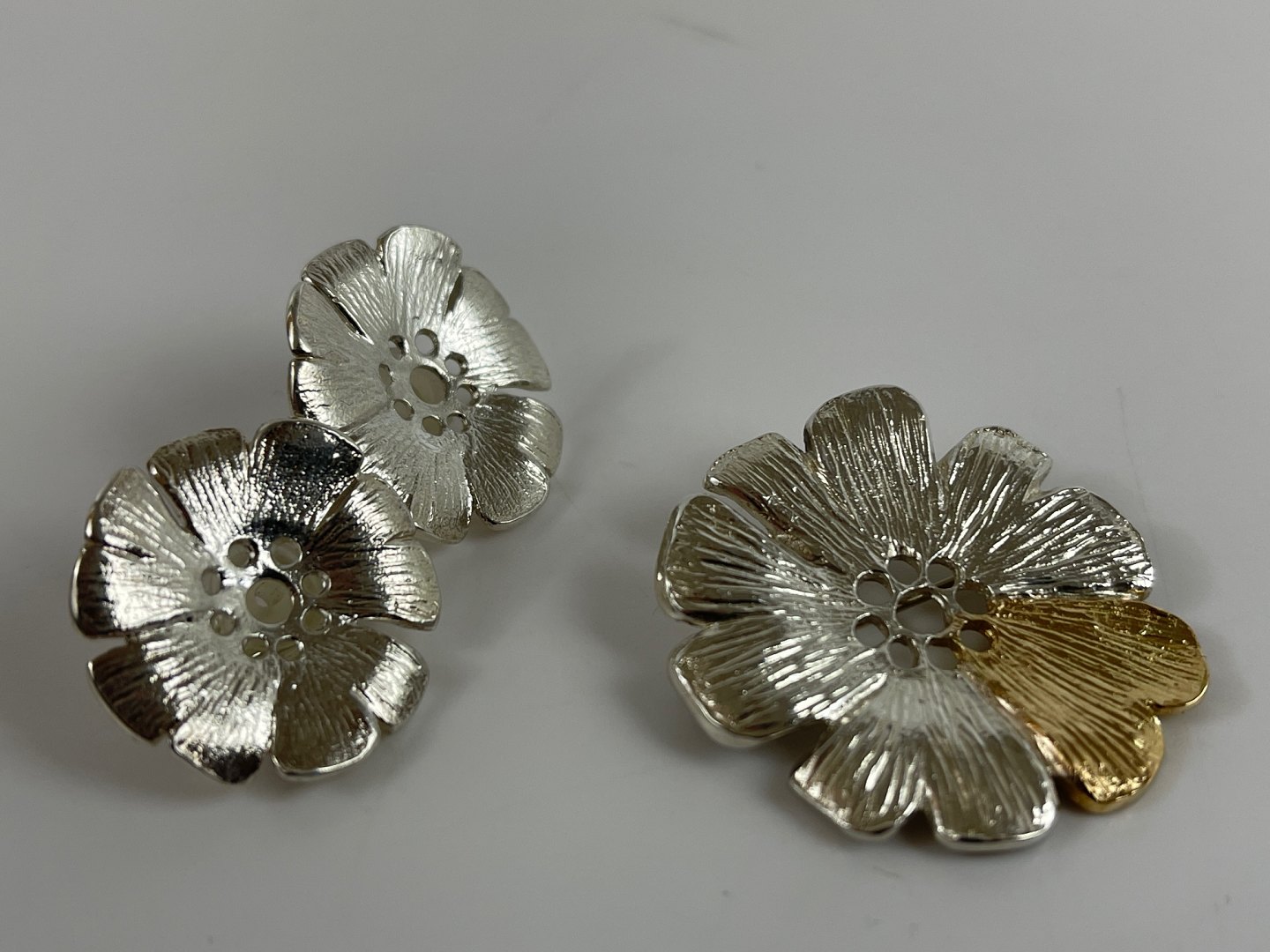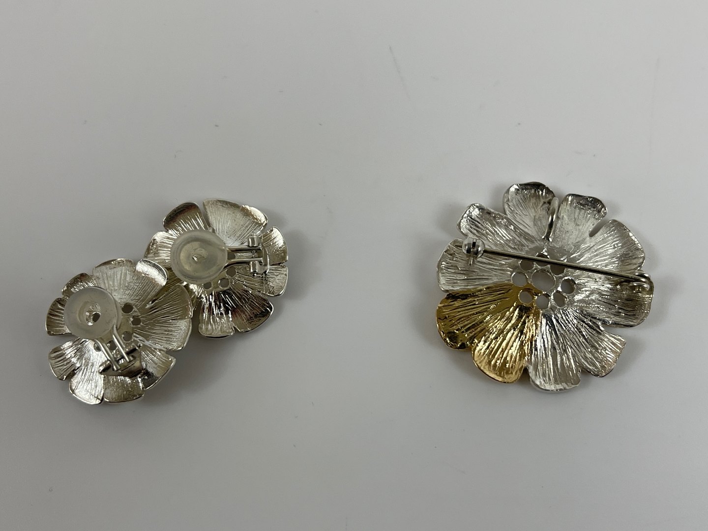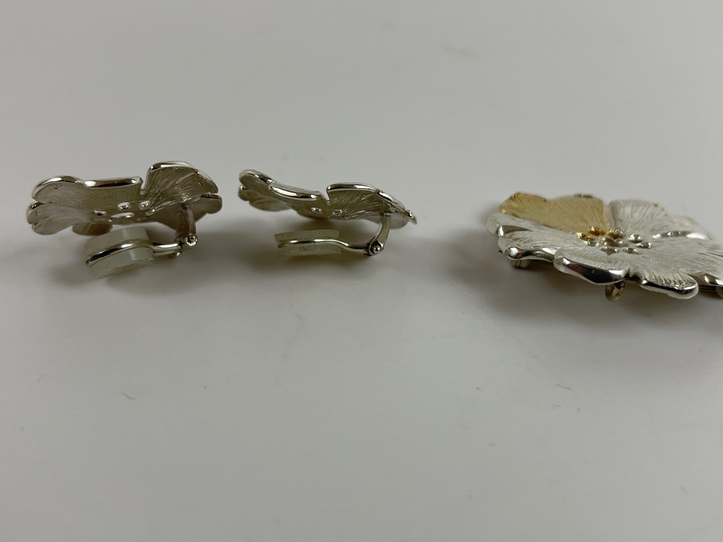 Flower smykkesæt af Traudel Toftegaard for Toftegaard Design. Sættet består af et par øreclips i sterling sølv samt et vedhæng / broche af sterling sølv med to guldblade. Sættet er i perfekt stand og er ubrugt. Nypris ca. DKK 7000. Toftegaard sølv og guld eksisterer ikke længere.