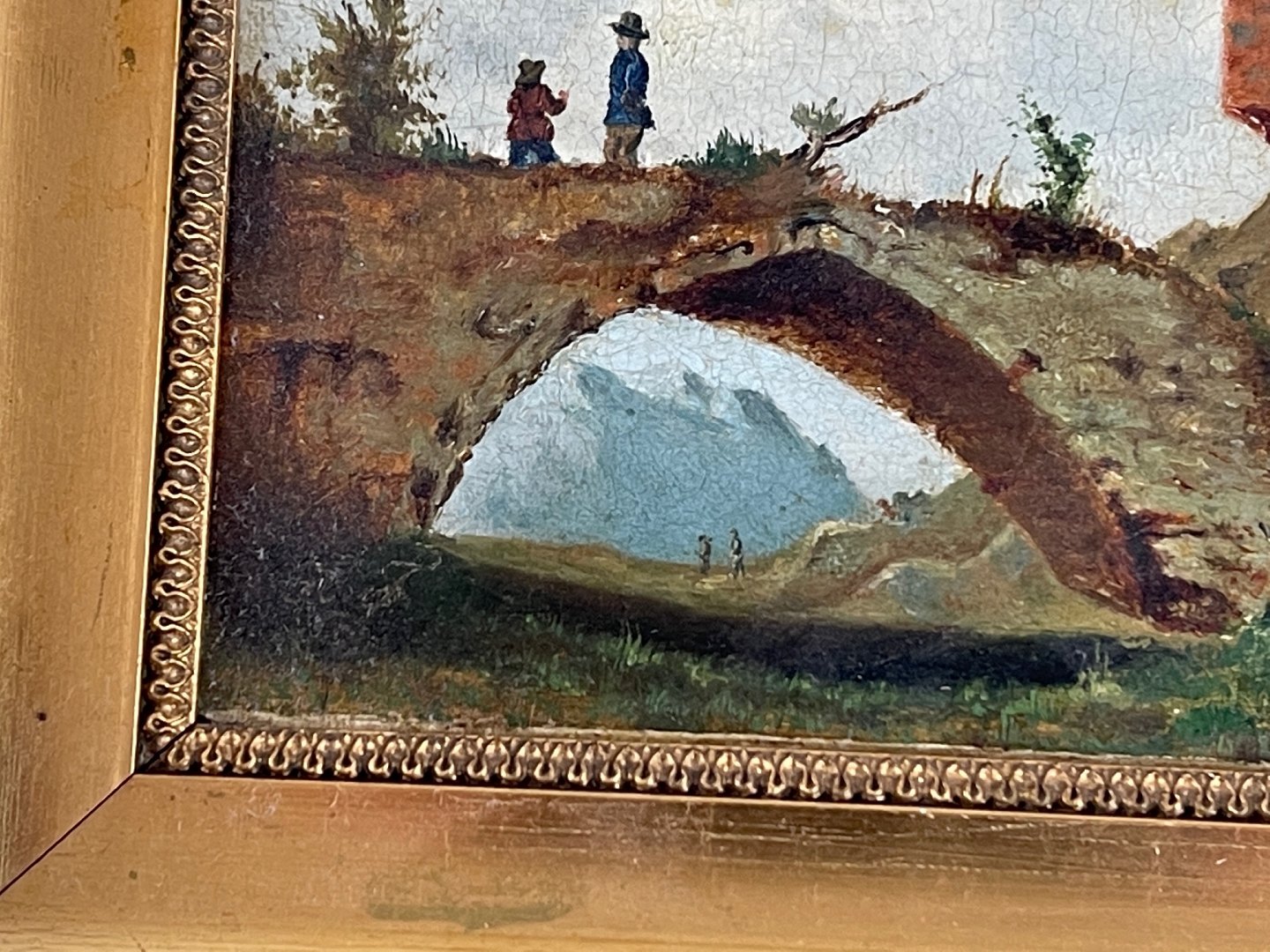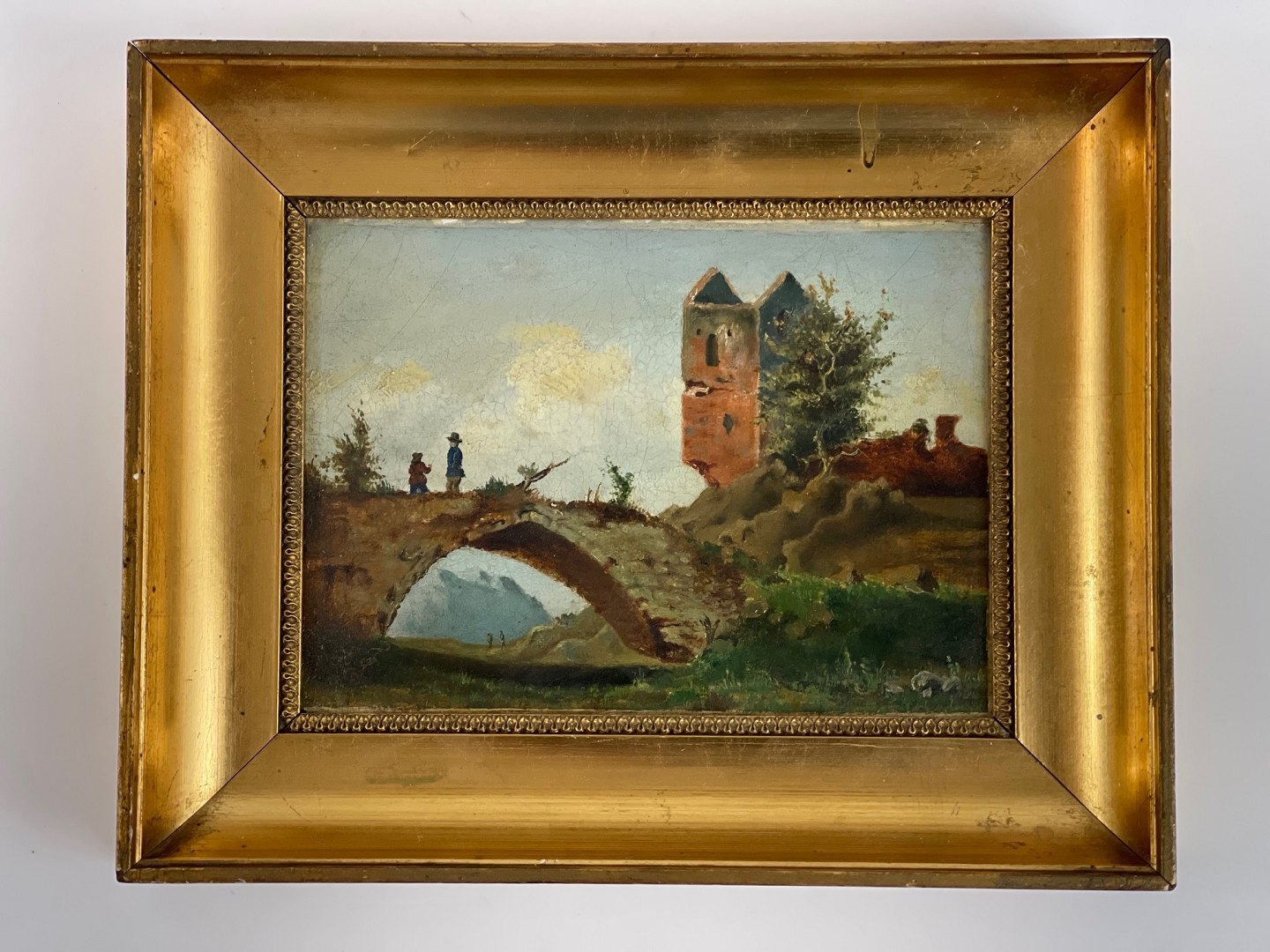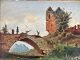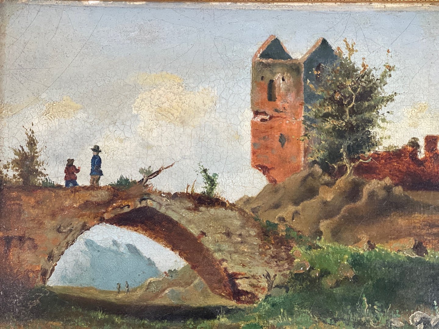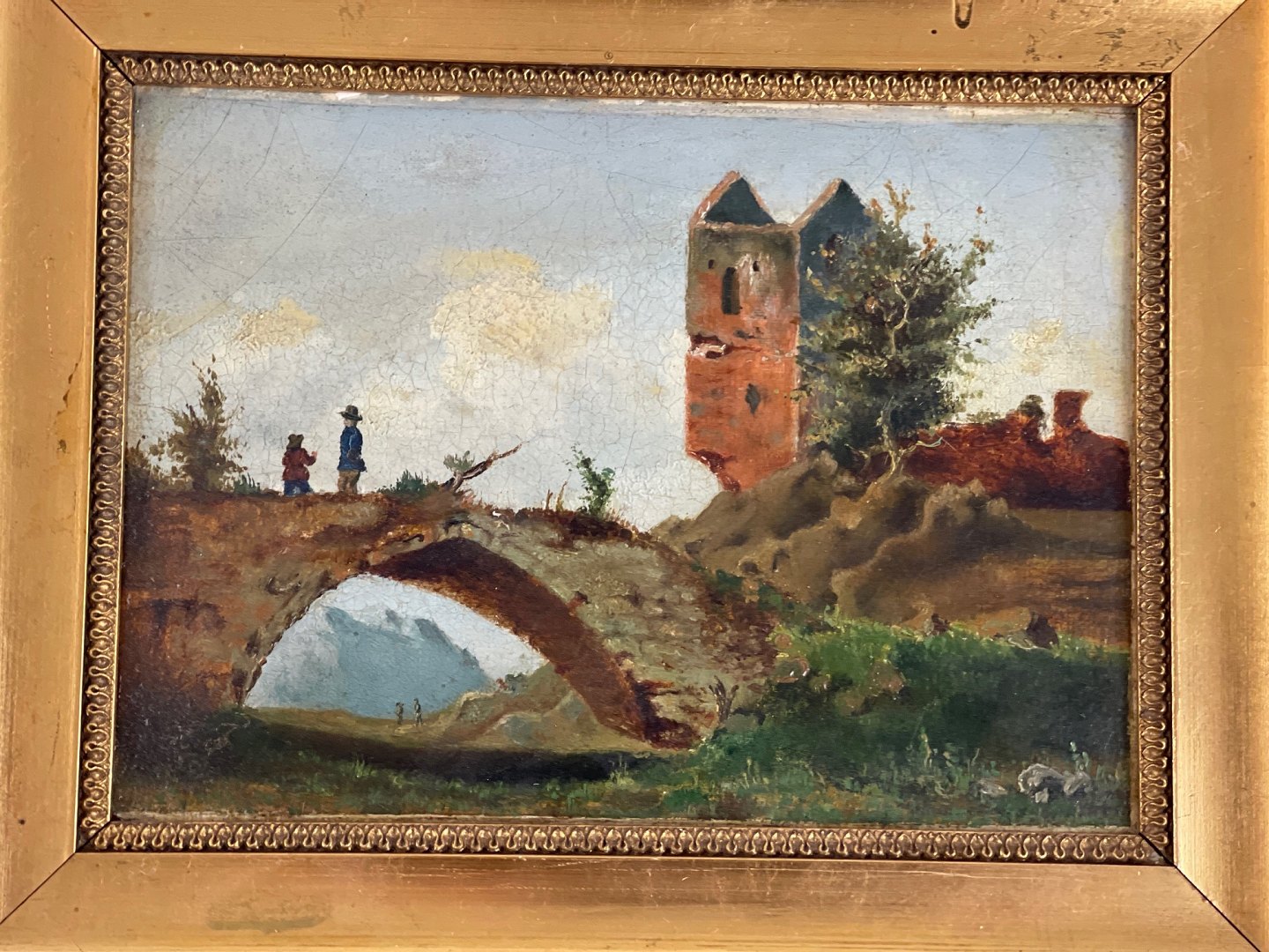 Maleri af landskab med bro, borg-ruin og mennesker - muligvis tysk eller østrisk - betegnet på bagsiden med blyant Hans Fischer, utydeligt signeret med initialer i nederste venstre hjørne.