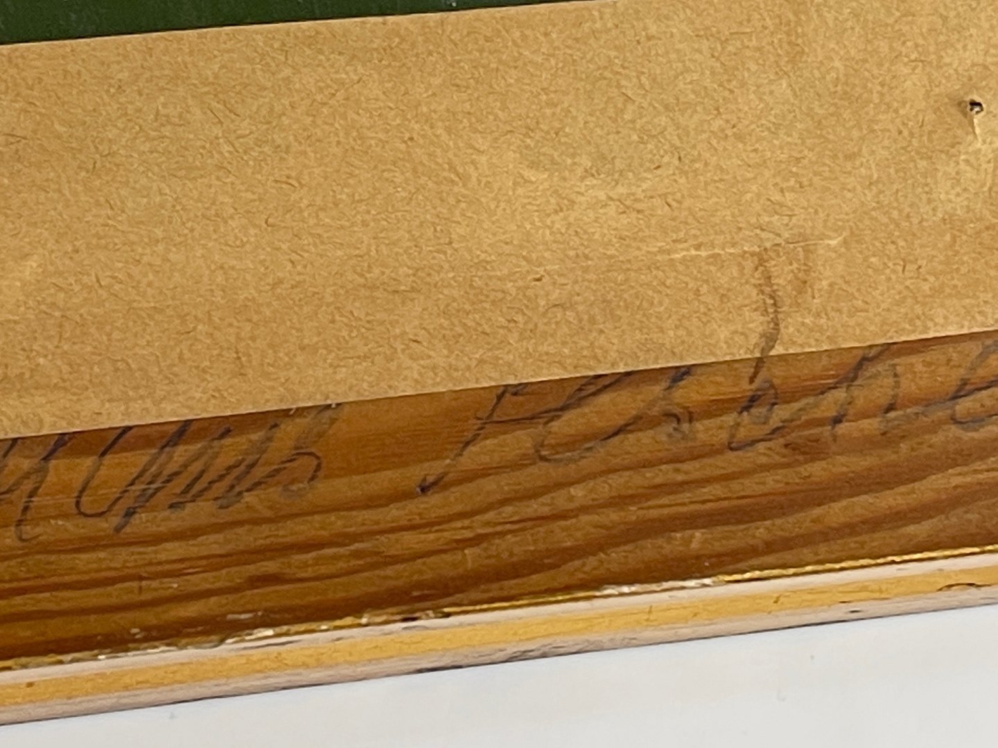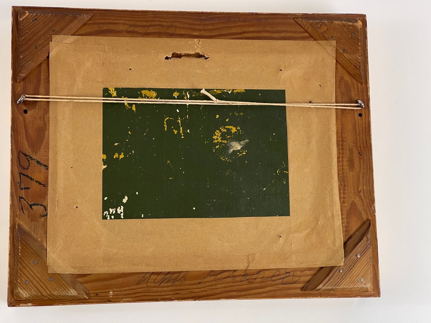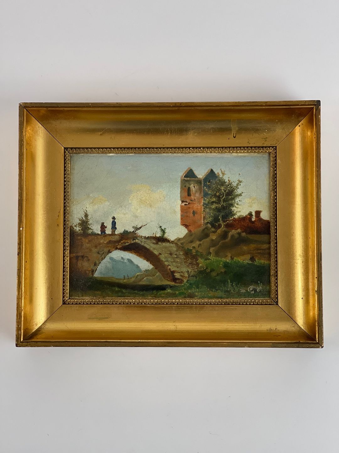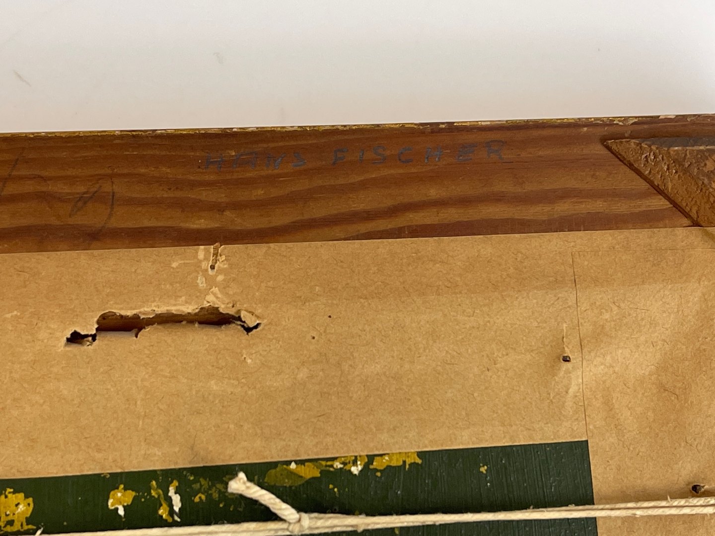 Maleri af landskab med bro, borg-ruin og mennesker - muligvis tysk eller østrisk - betegnet på bagsiden med blyant Hans Fischer, utydeligt signeret med initialer i nederste venstre hjørne.