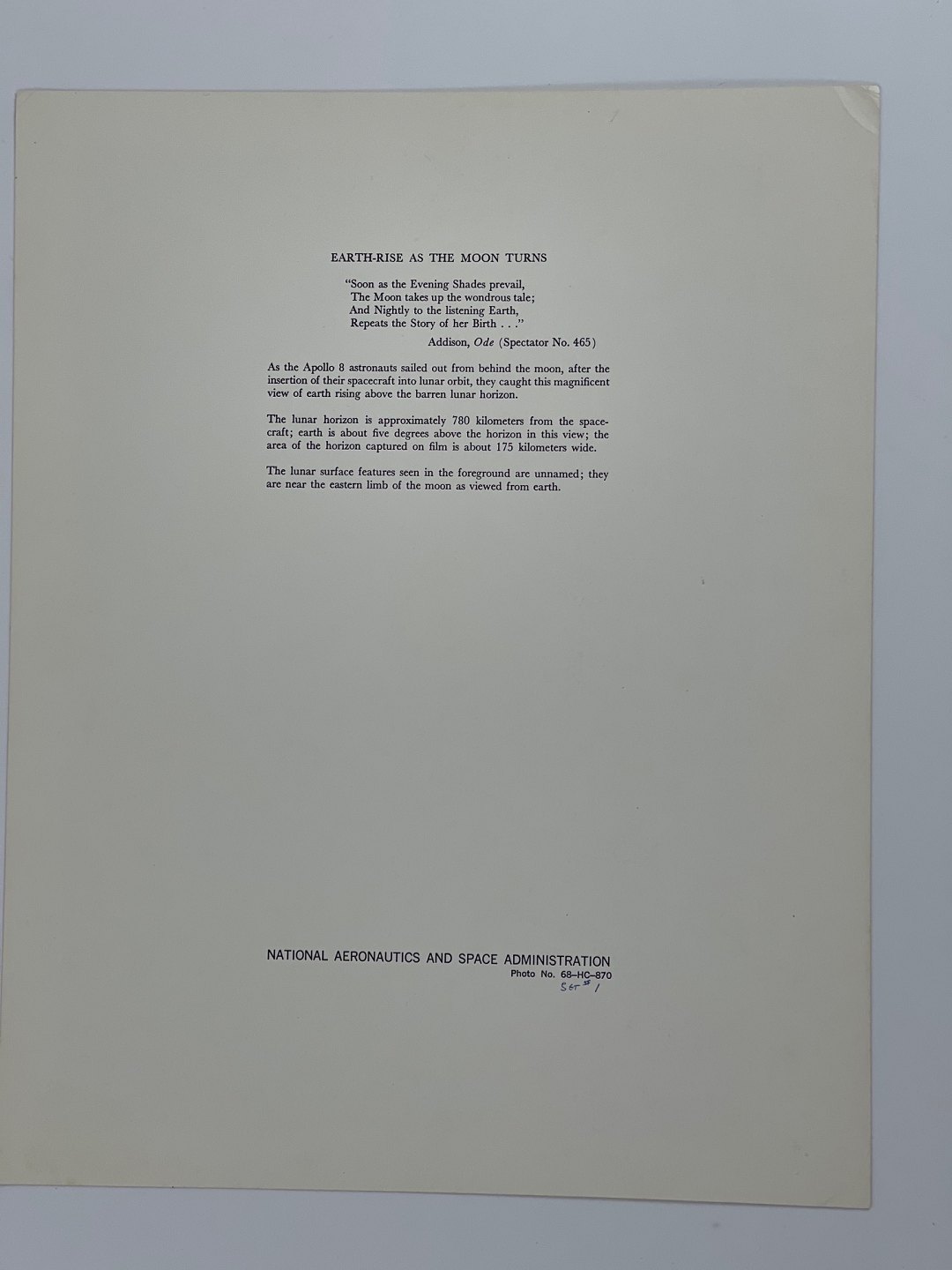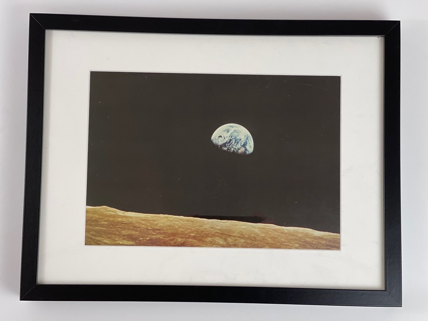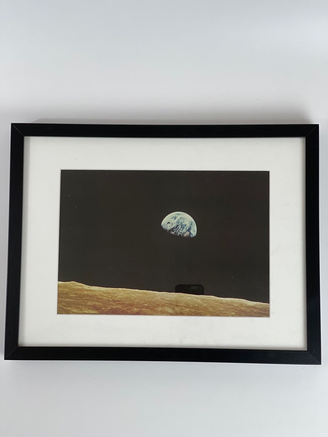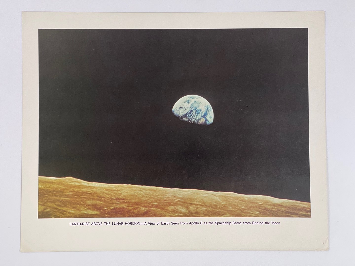 Det berømte NASA (The National Aeronautics and Space Administration) foto "Earth Rise" som vintage farveoffsetfoto / fotoplakat / fotoprint fra slutningen af 1960'erne. Motivet er jorden - den blå planet - som ses over månens overflade i den nederste del af billedet.