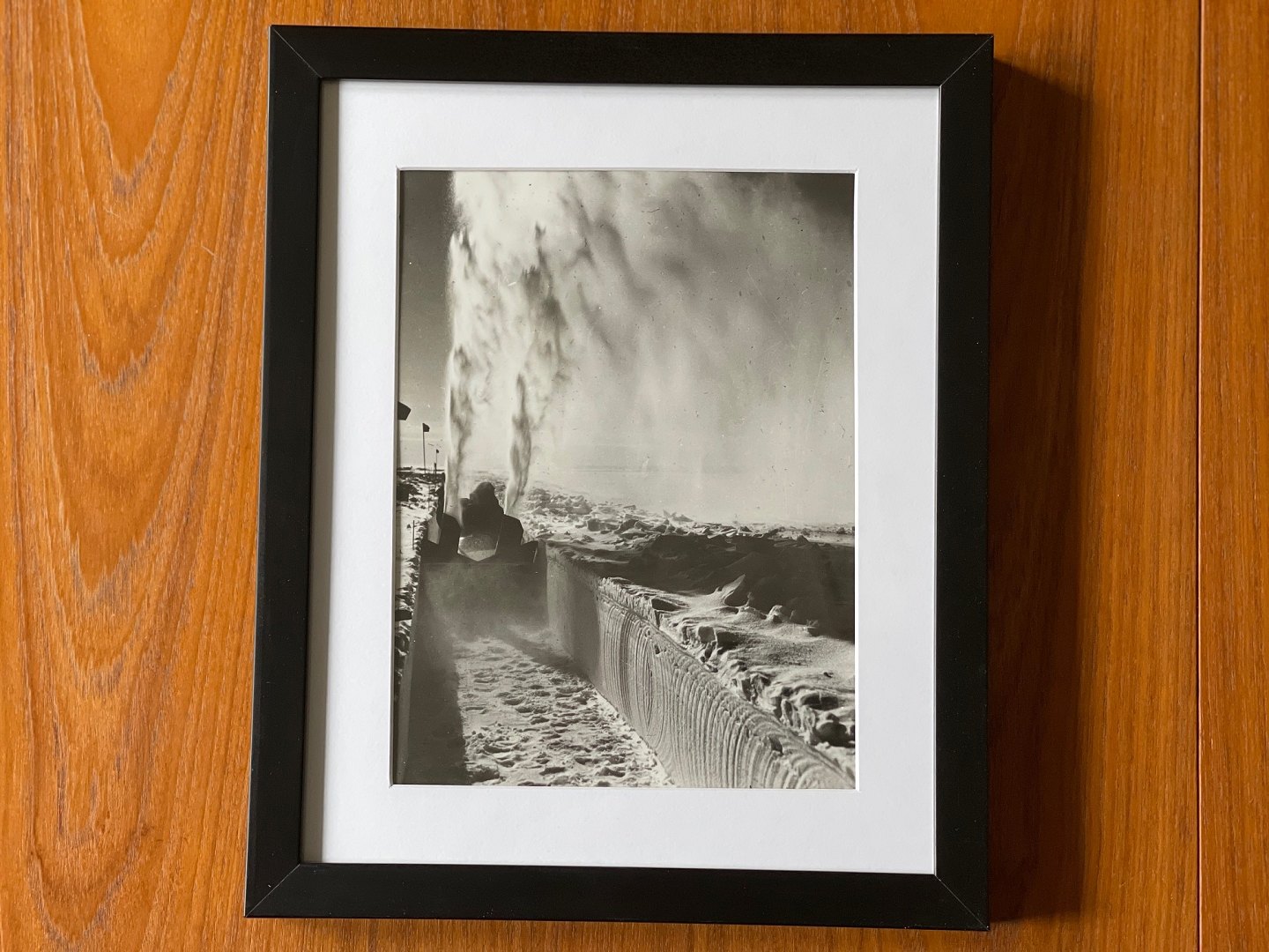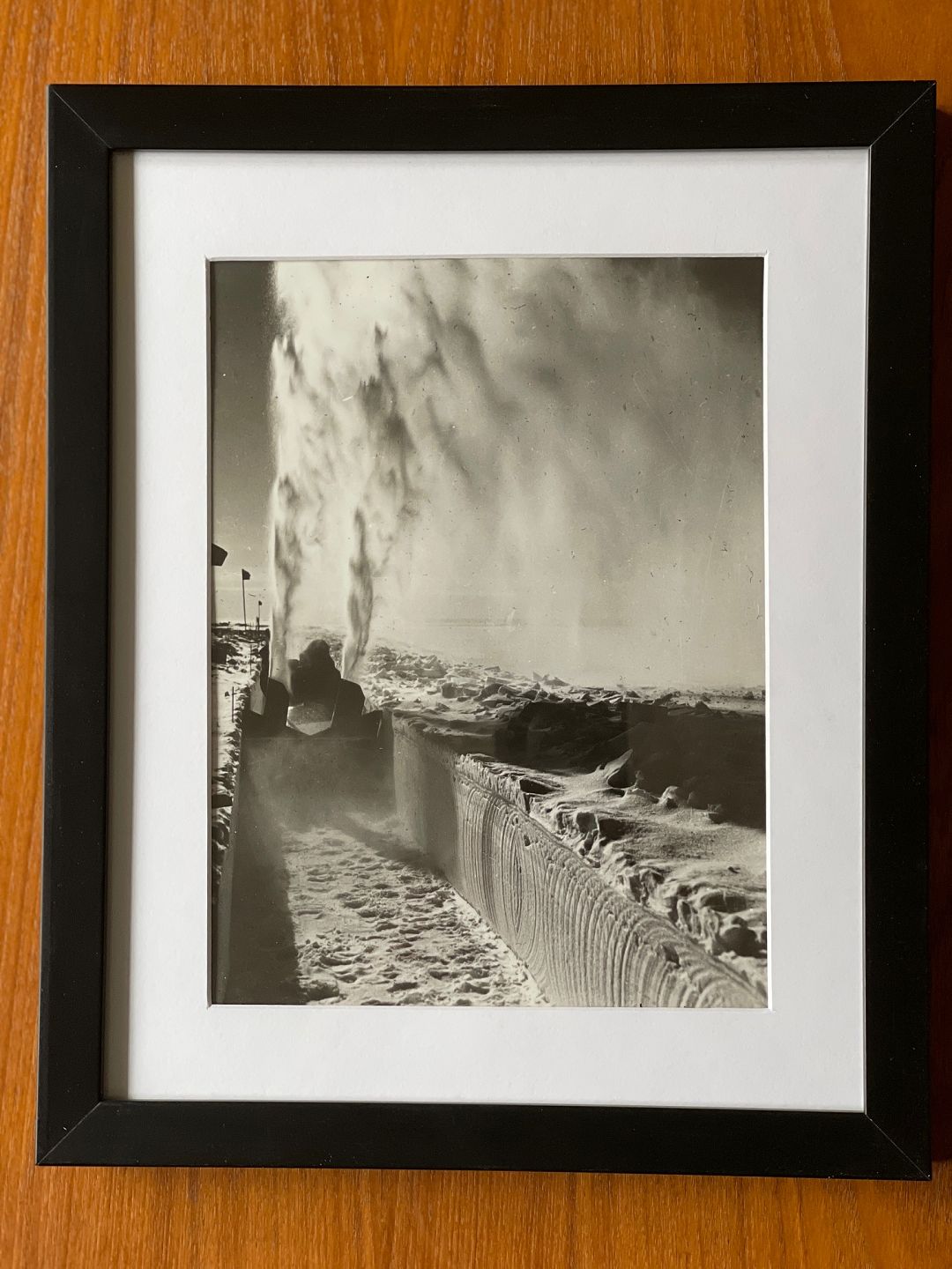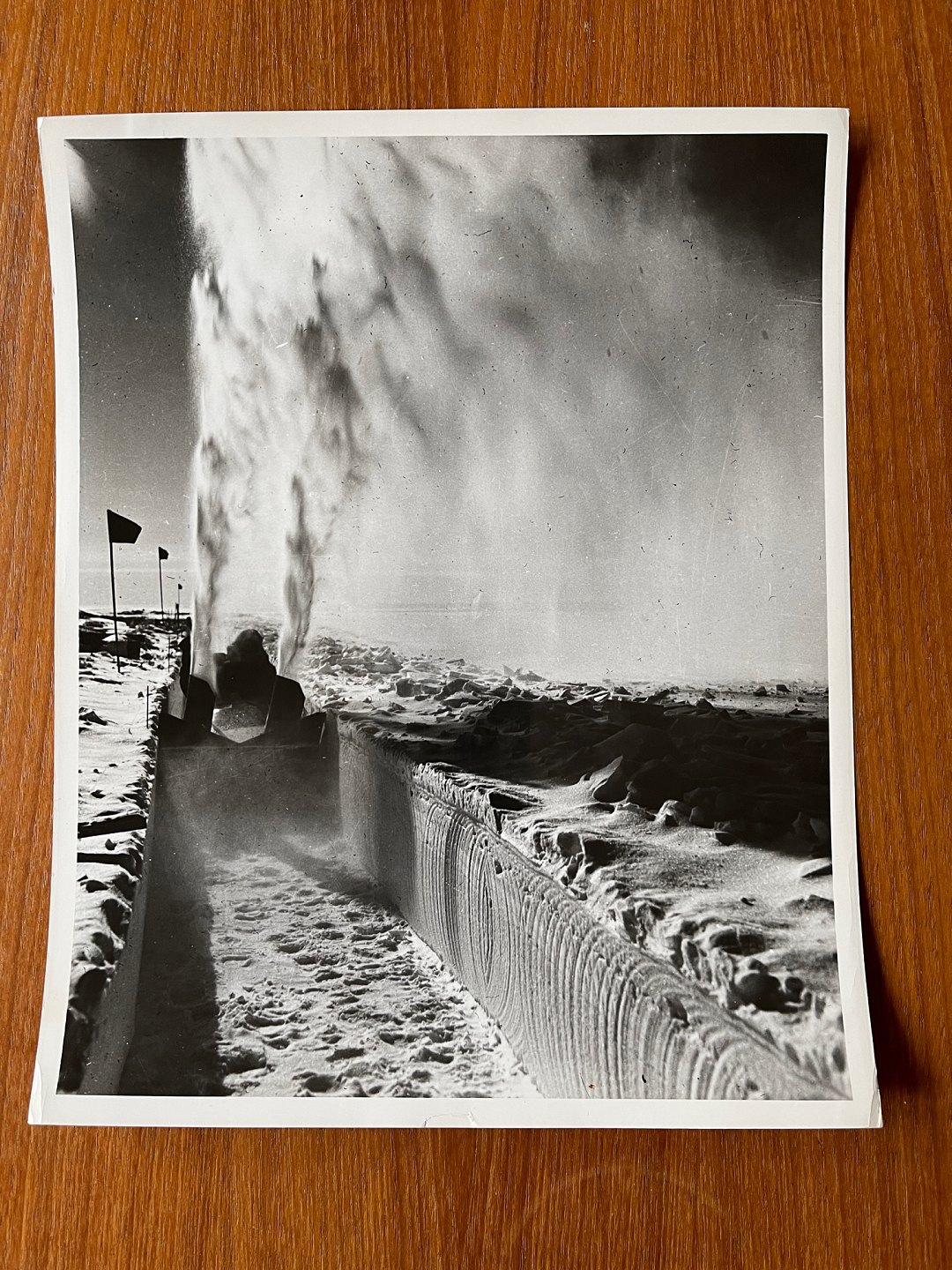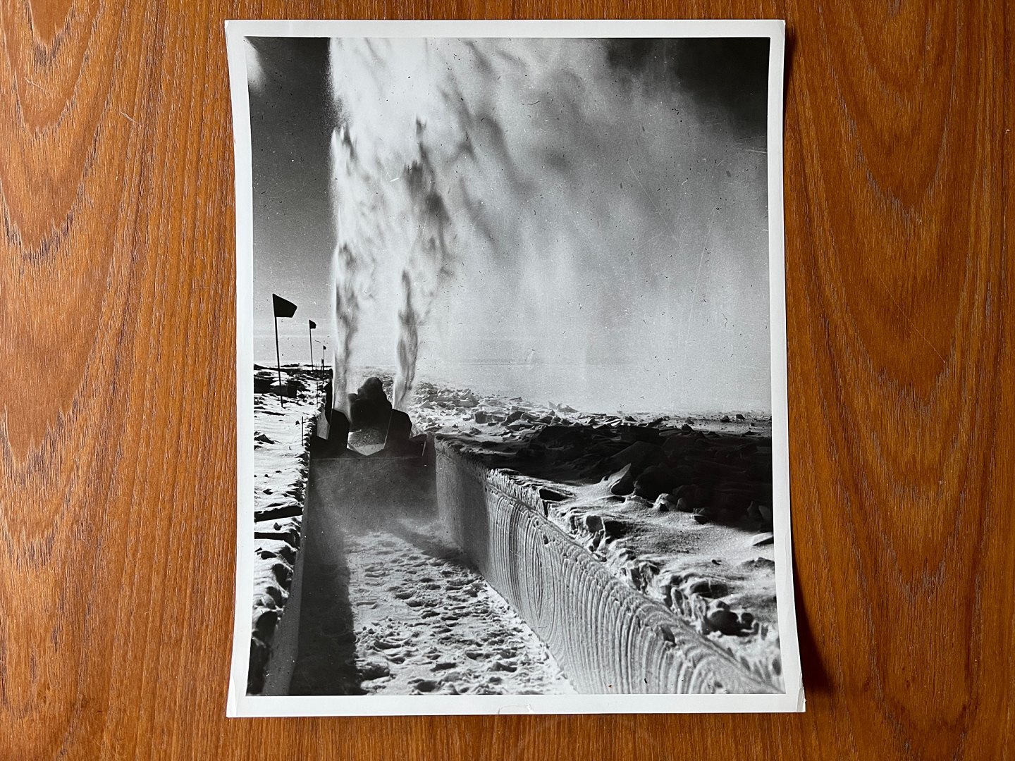 Originalt sort-hvidt vintage foto fra Grønland i 1955 af en såkaldt Peter Snow Miller maskine, der blev brugt til at grave render i indlandsisen under den kolde krig, da Thule Air Base / Pituffik / Thulebasen blev opført, og amerikanerne gik i gang med at bygge Camp Century - en hel by under indlandsisen, som en del af det tophemmelige projekt "Project Iceworm", som end ikke den danske regering kendte til. Projekt Iceworm handlede om at konstruere et kæmpe net af jernbanetunneller under indlandsisen, der skulle huse mere end 600 atommissiler.