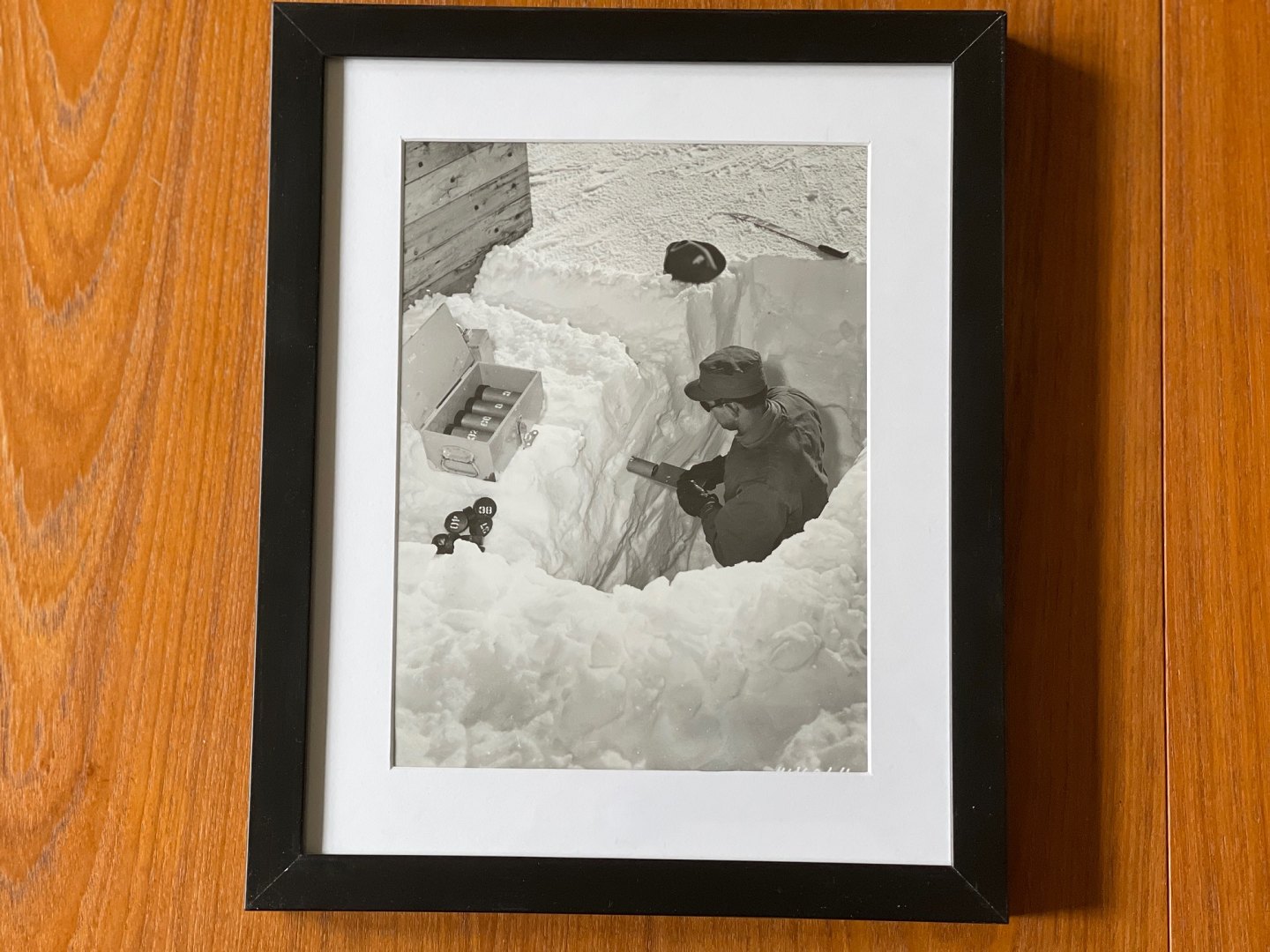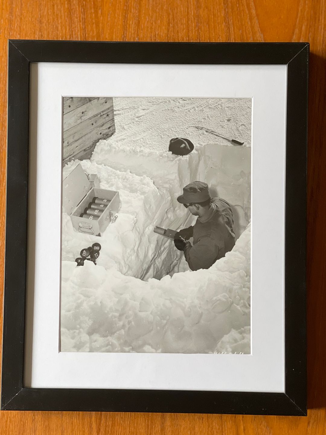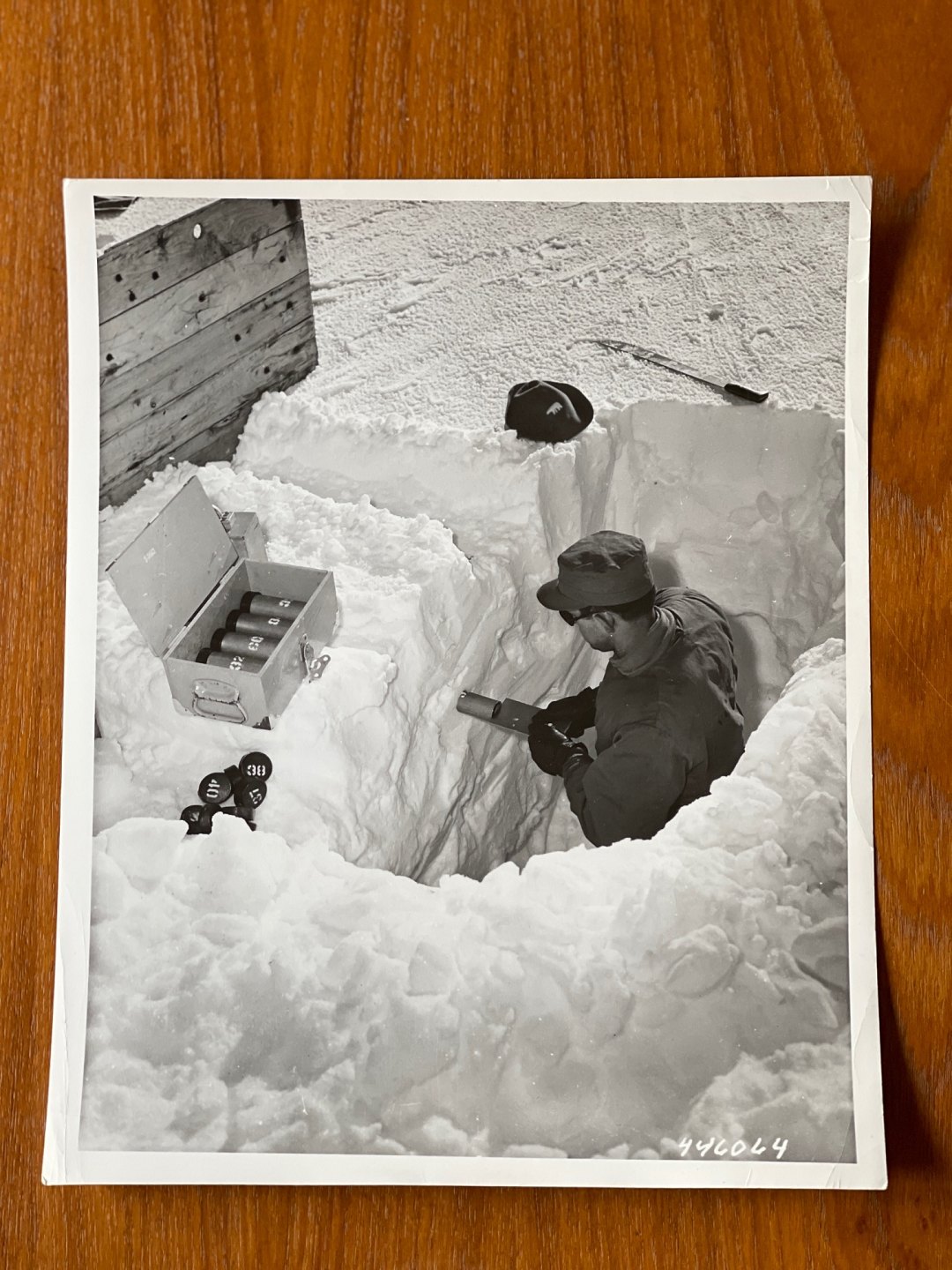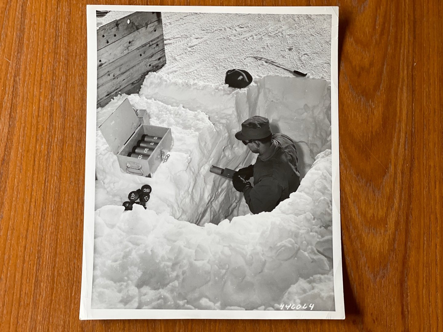 Billedet viser en amerikansk soldat fra ingeniørtropperne, USACE, der tjekker tykkelsen af isen i den grønlandske undergrund. En viden som USA bl.a. fik brug for ved konstruktionen af gange i den underjordiske by Camp Century, der blev bygget få år senere nord for Thulebasen / Pituffik, samt under project Iceworm, der handlede om at konstruere et net af jernbanetunneller under indlandsisen, der skulle huse mere end 600 atommissiler.