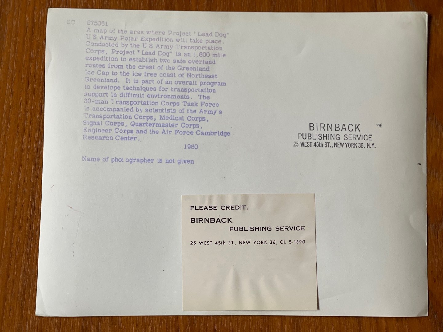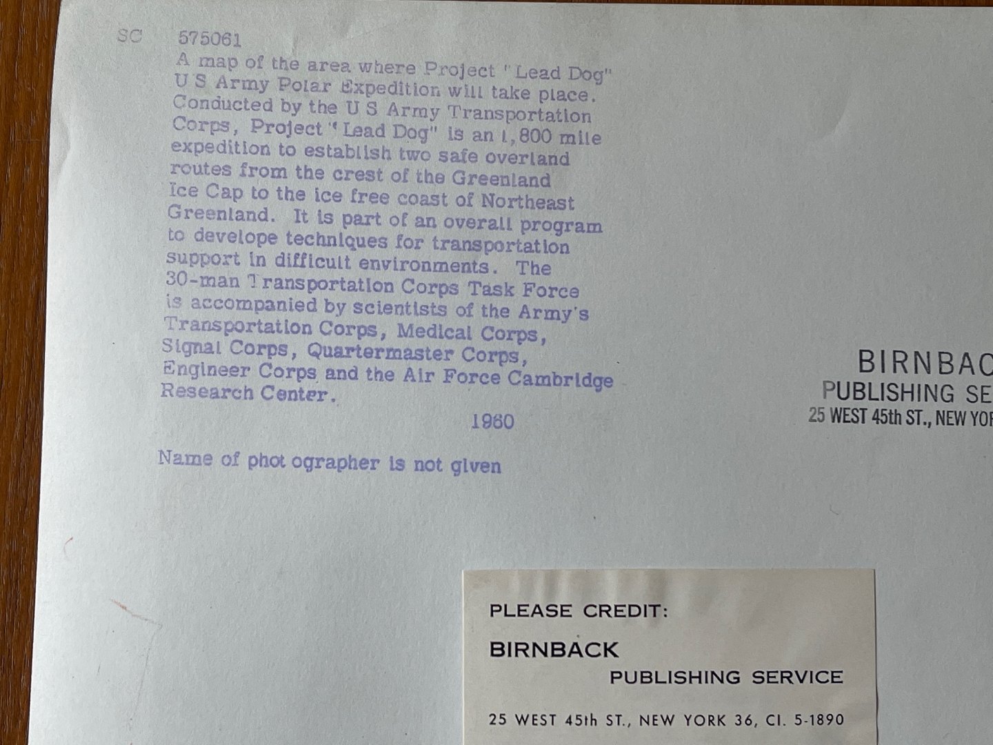 "A map of the area where Project "Lead Dog" US Army Polar Expedition will take place. Conducted by the U S Army Transportation Corps, Project "Lead Dog" is an 1,800 mile expedition to establish two safe overland routes from the crest of the Greenland Ice Cap to the ice free coast of Northeast Greenland. It is part of an overall program to develop techniques for transportation support in difficult environments. The 30-man Transportation Corps Task Force is accompanied by scientists of the Army's Transportation Corps, Medical Corps, Signal Corps, Quartermaster Corps, Engineer Corps and the Air Force Cambridge Research Center. 1960. Name of photographer is not given"