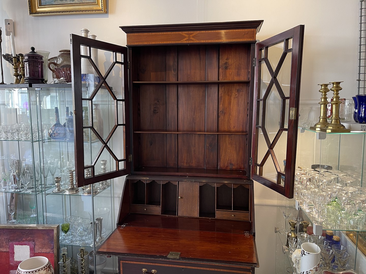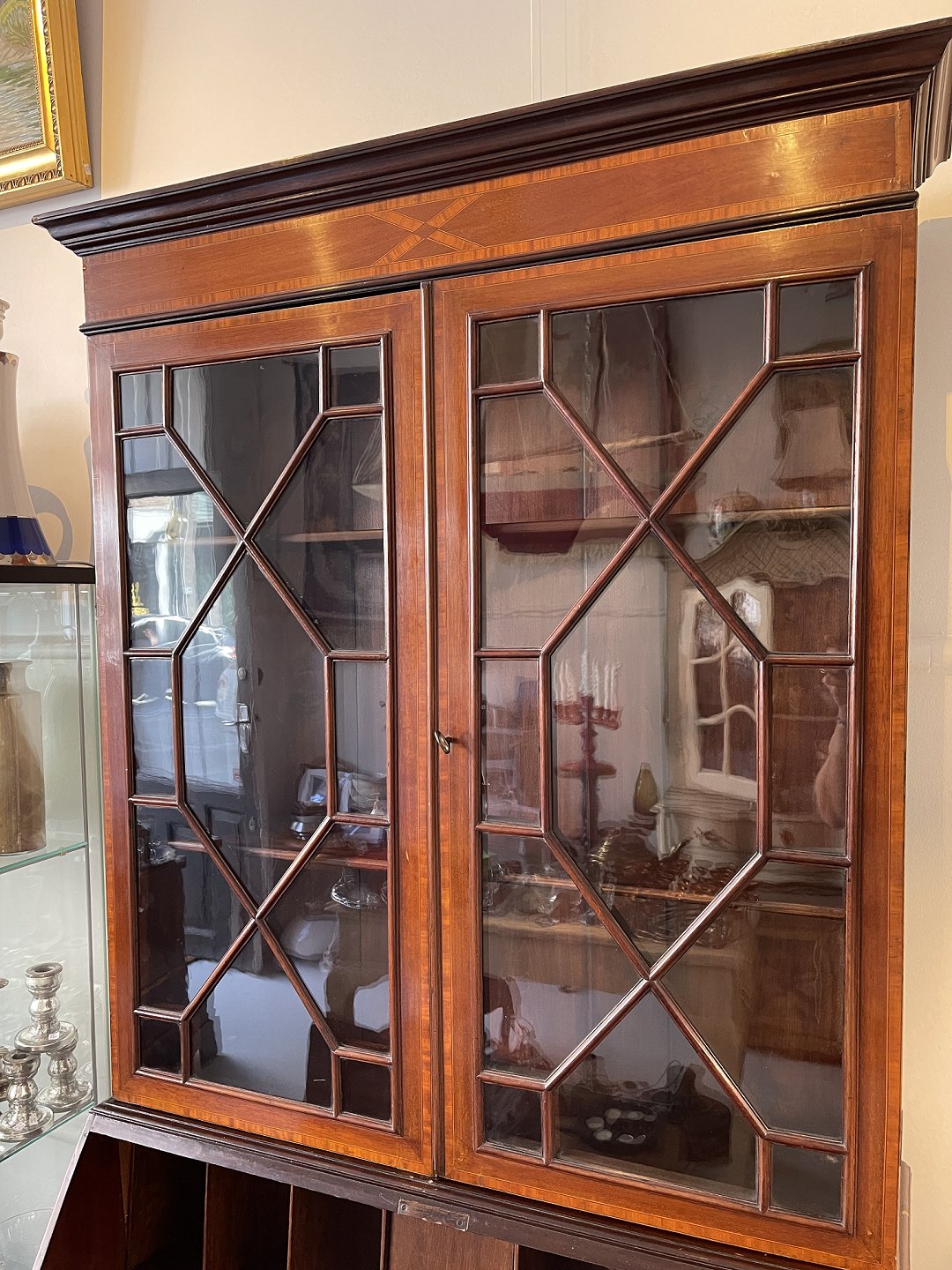 Antikt engelsk chatol med bogskab, intarsia-border samt konkylie på klap. 19. århundrede. Restaureret.