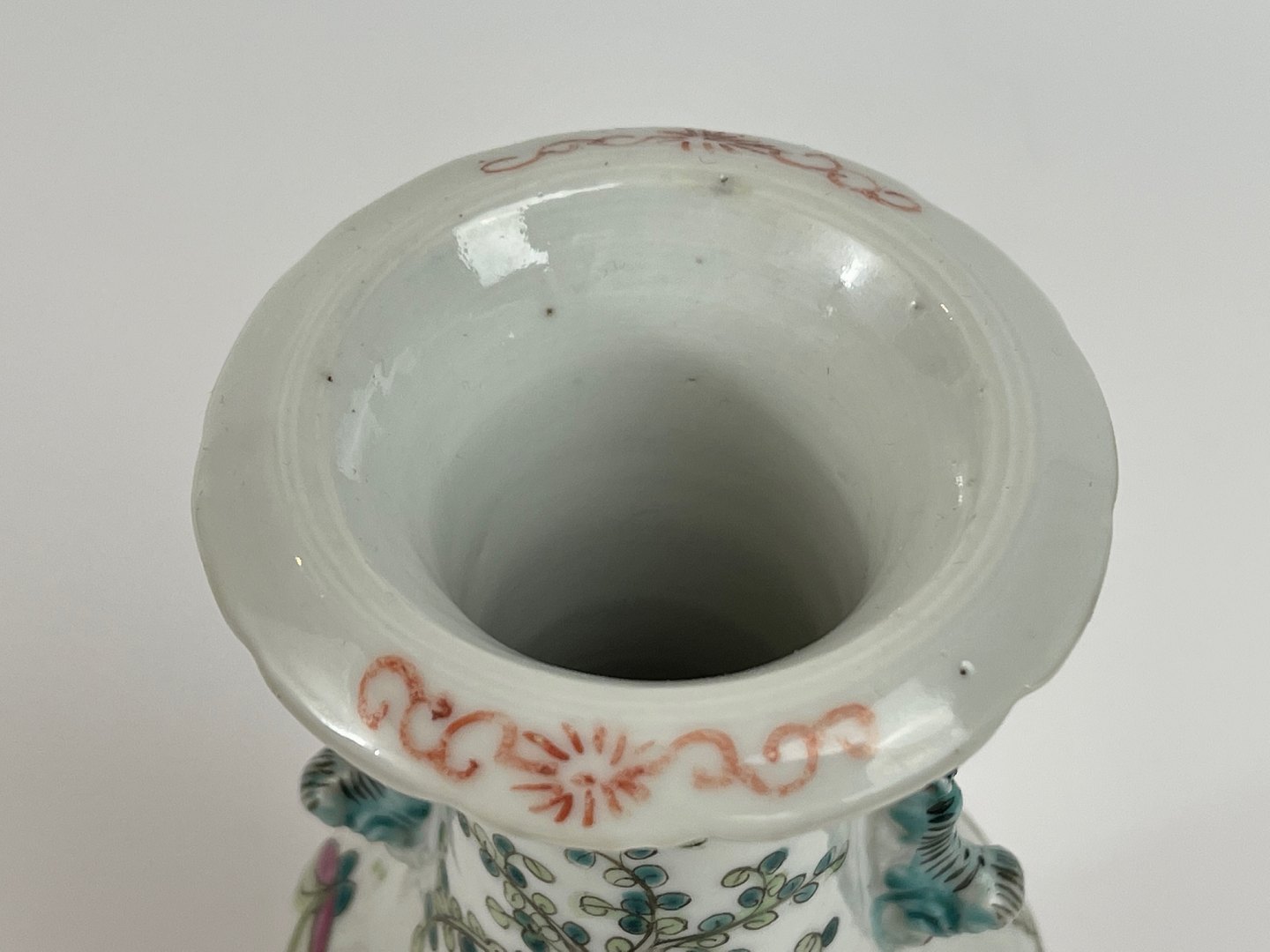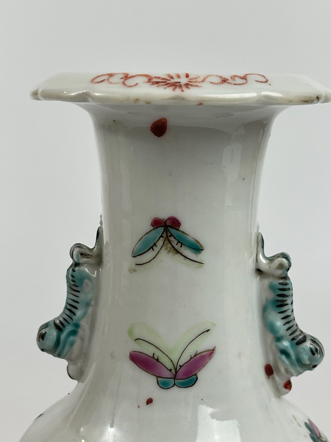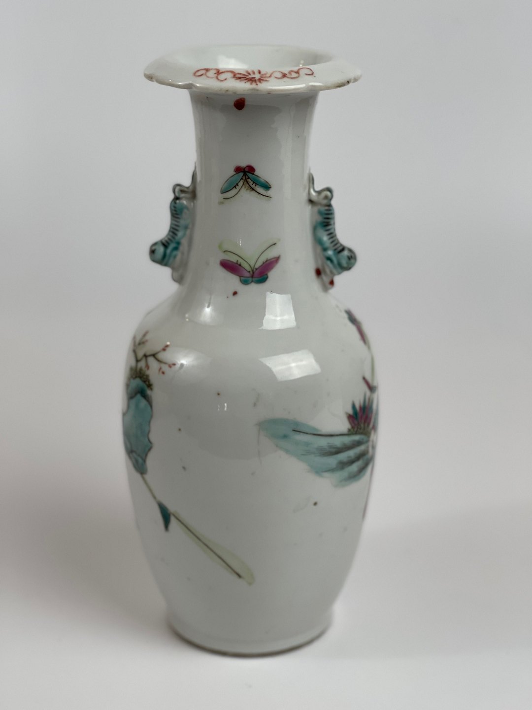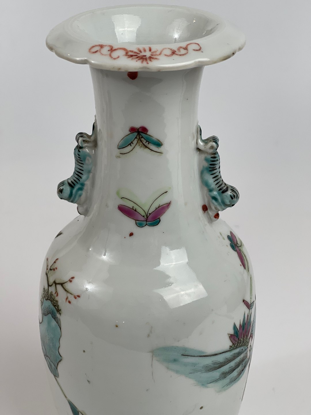 Kinesisk familien rose vase med havescener og personer - træ, buske, blomster og sommerfugle. Mænd med bl.a. vase, våben og hat. Sent 19. århundrede eller tidligt 20. århundrede.