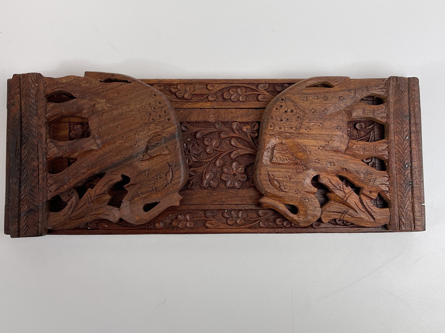 Vintage bogreol af træ med udskårne elefanter og blomster til at stille på bordet. Reolen kan trækkes ud. 20. århundrede. Indisk.