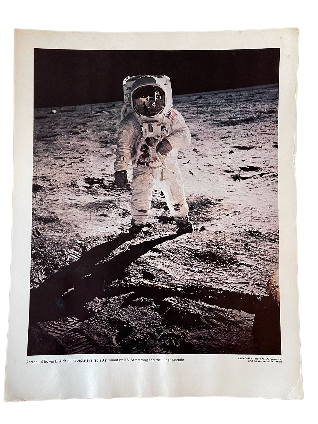 De første mennesker på månen: Stort, originalt NASA farveoffsetfotografi fra Apollo 11 i juli 1969. Det ikoniske billede viser astronaut Edwin Aldrin stående på månens overflade. I visiret på hans hjelm ses den 1. mand på månen Neil Armstrong samt Apollo 11 landingsmodulet.