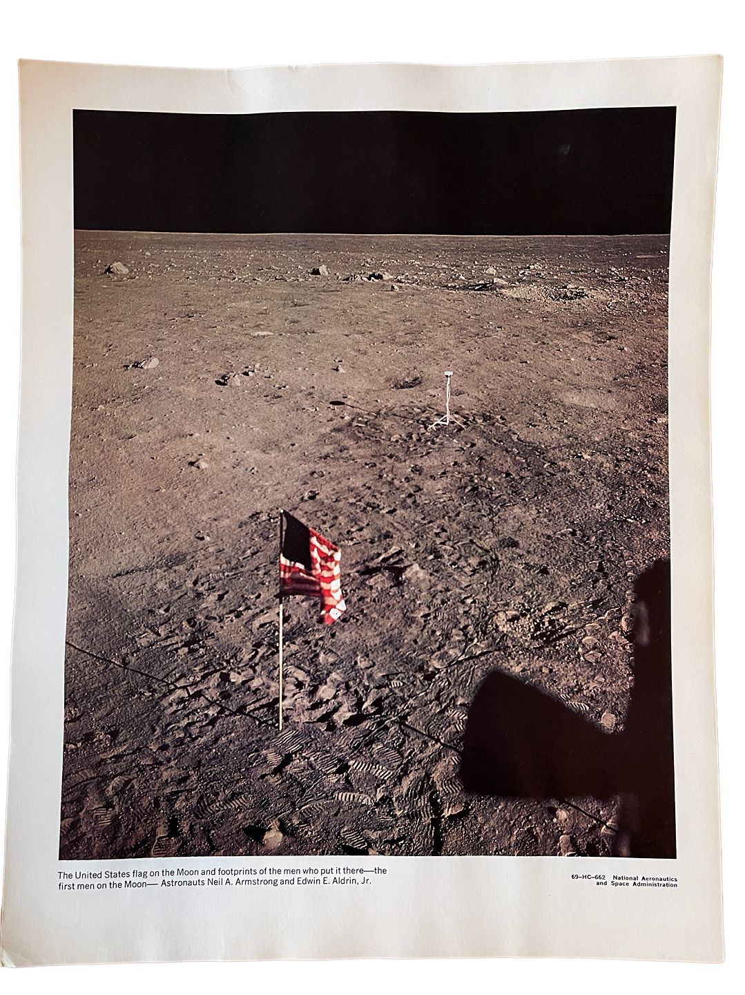 Originalt NASA farveoffsetfotografi fra Apollo 11 månelandingen i juli 1969. Det amerikanske flag Old Glory plantet på månen. Man ser også fodspor fra astronauterne Neil Armstrong og Edwin Aldrin, som blev de to første mennesker på månen.
