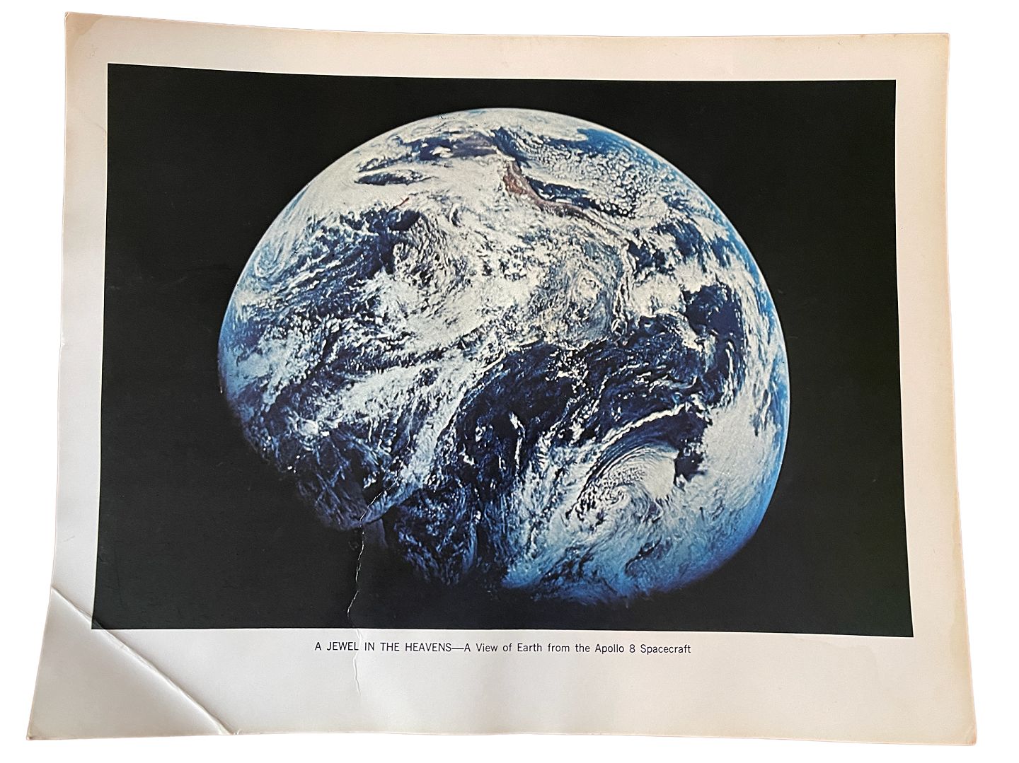 Stort, originalt NASA farveoffsetfotografi fra Apollo 8 rumrejsen. Billedet viser vores "blå planet", jorden, set fra rummet.