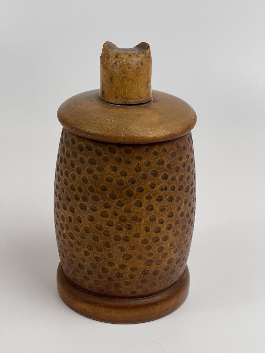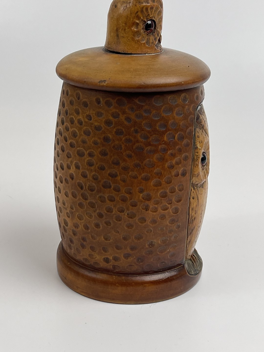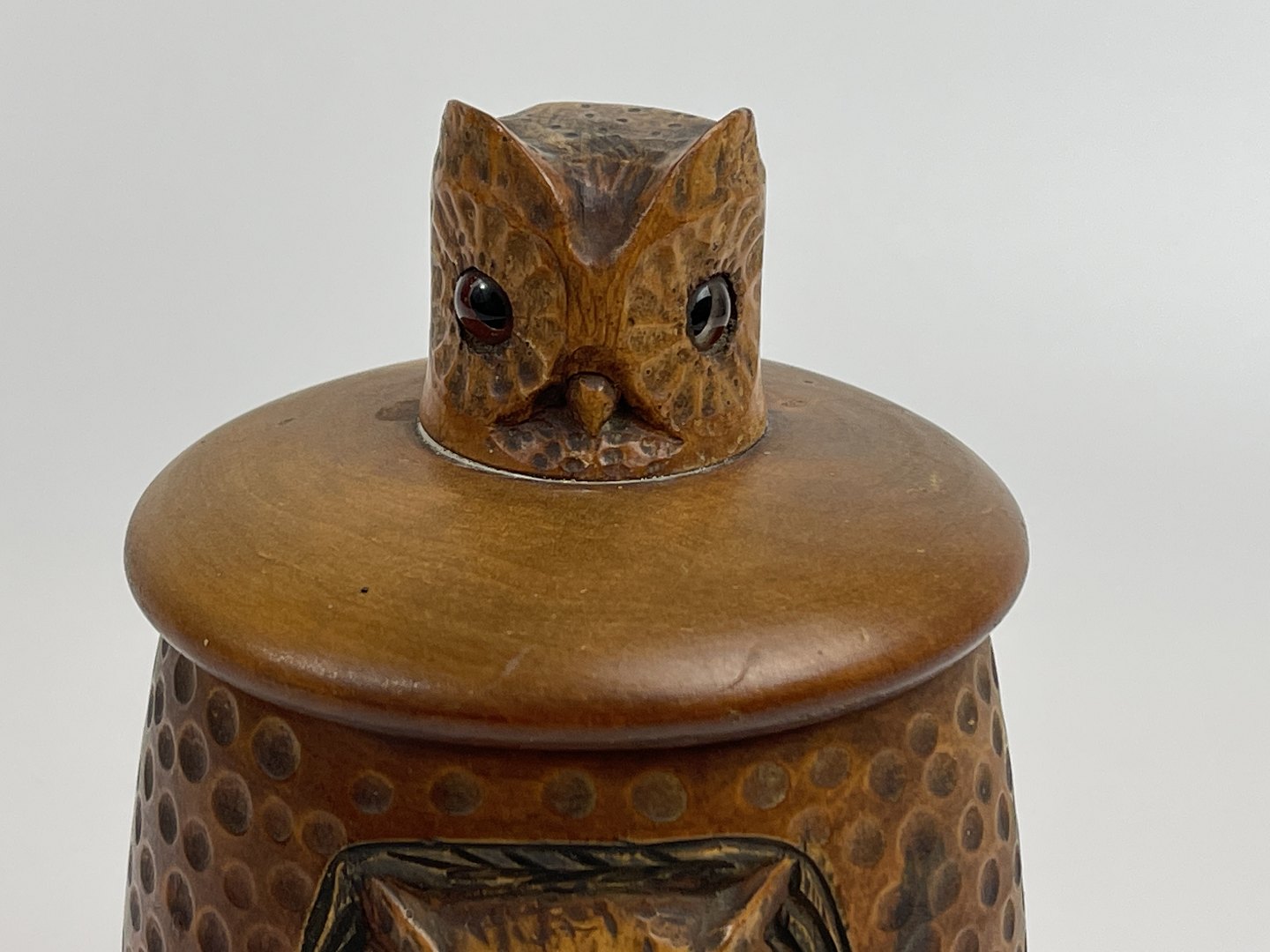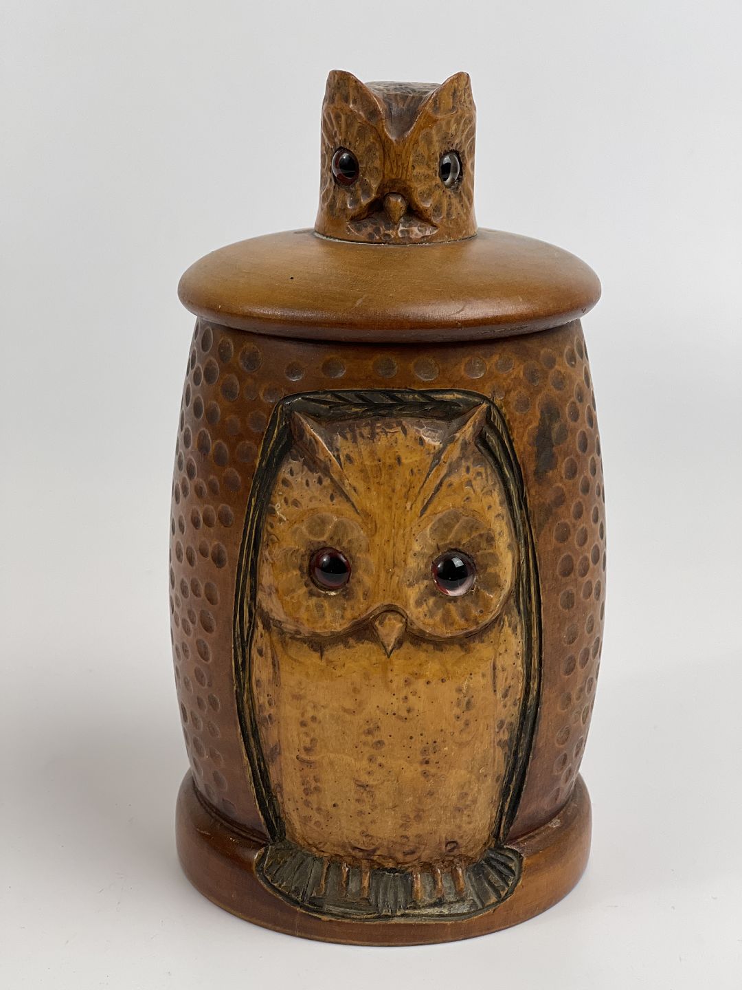 Håndlavet tobakskrukke / lågkrukke i træ med udskåret ugle i relief. Mindre uglehoved er udskåret og påsat som håndtag til låget. Begge ugler har glasøjne. 1 halvdel af det 20. århundrede.