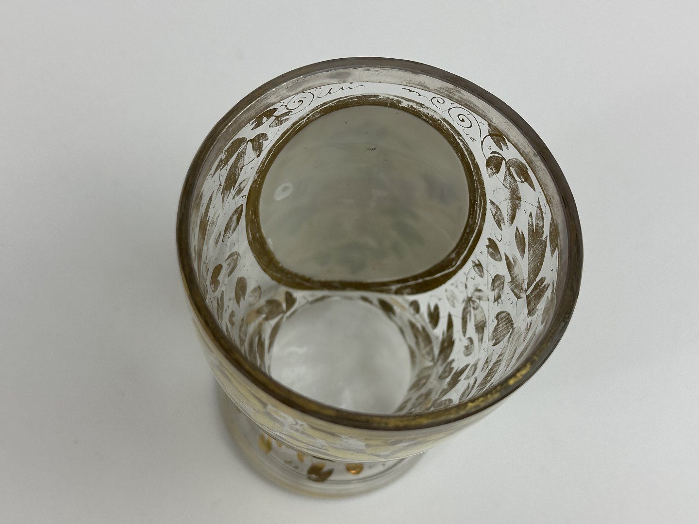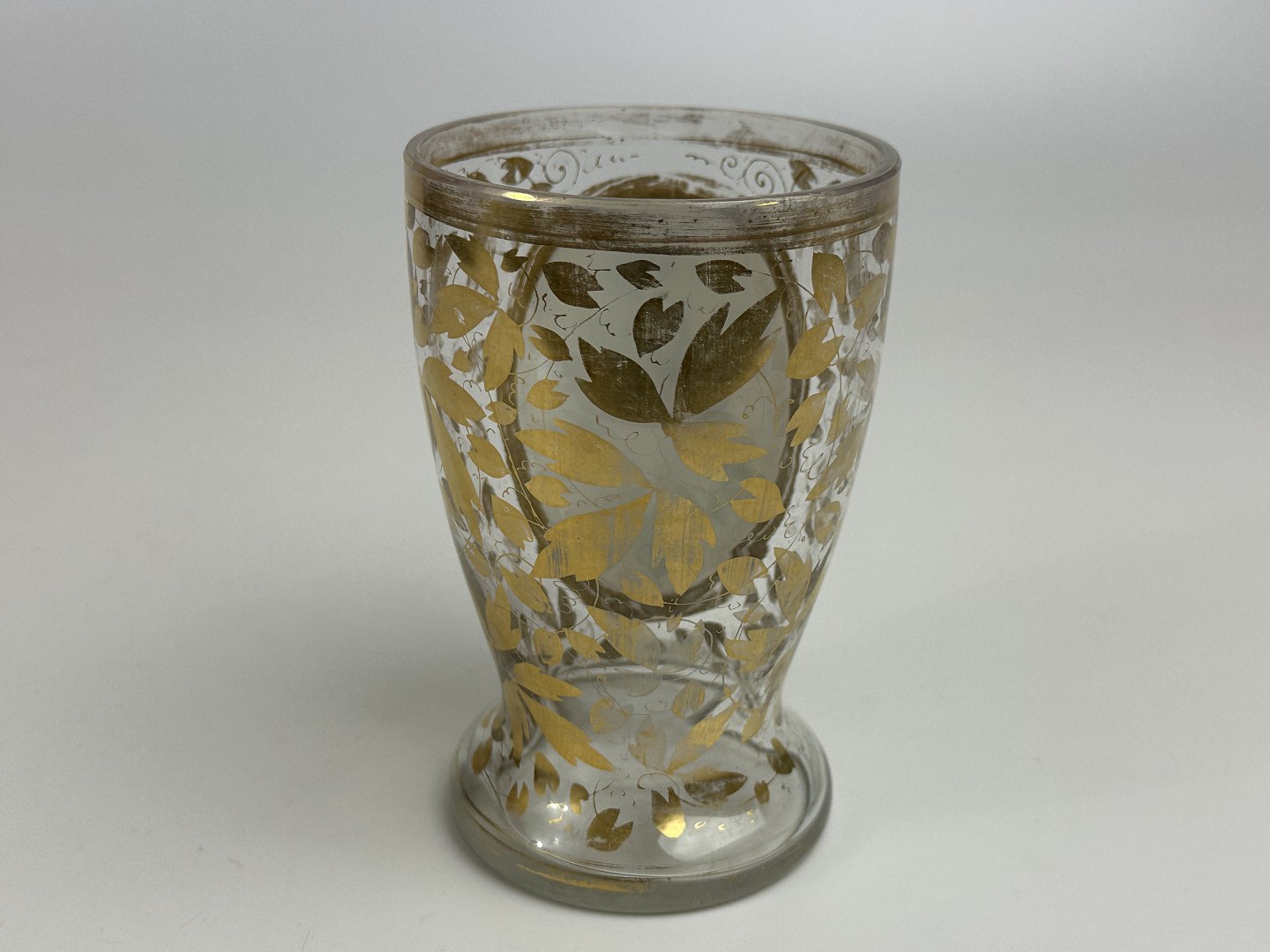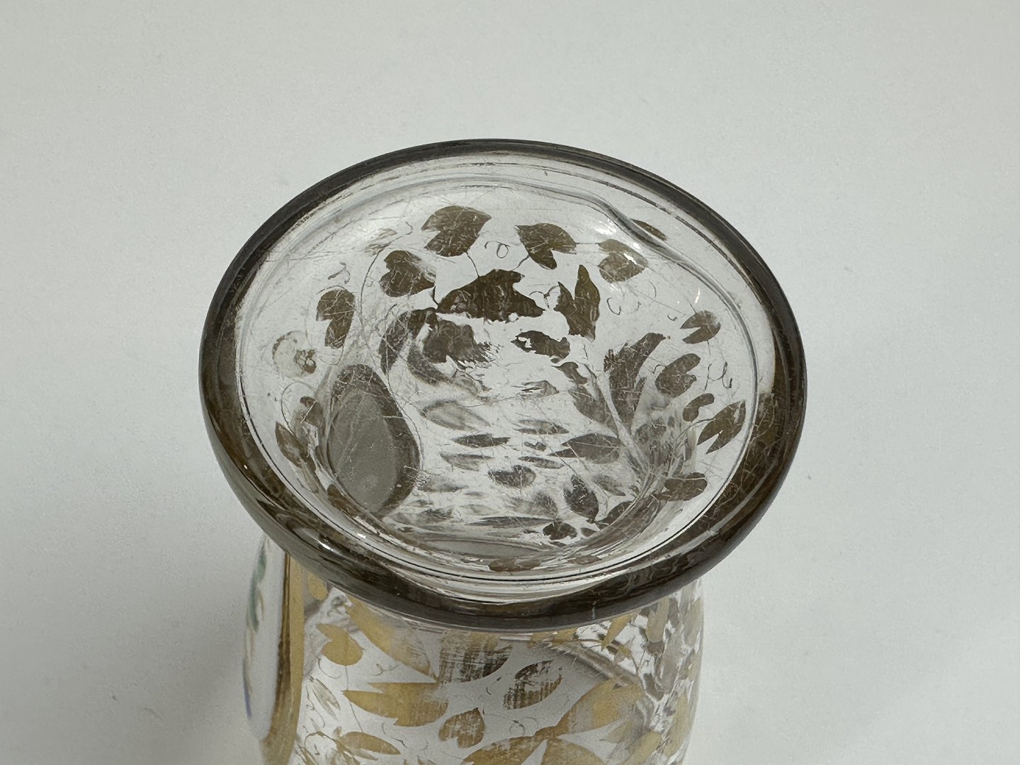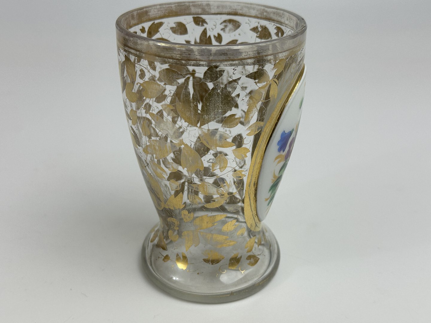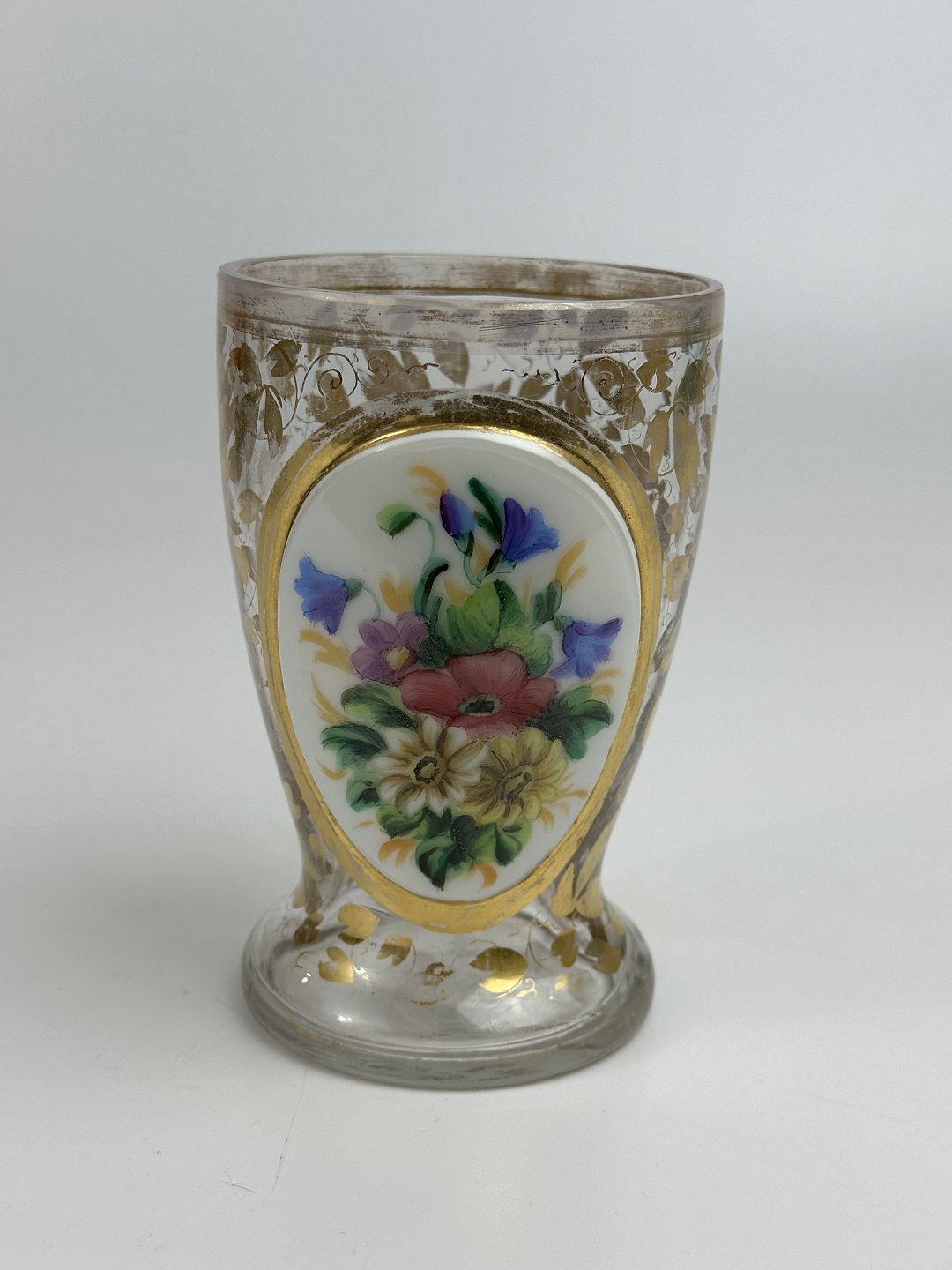 Bøhmisk drikkeglas med dekoration af bladværk i guld samt emalje bemalet plakette med blomsterbuket på front. Bøhmen 19. århundrede.