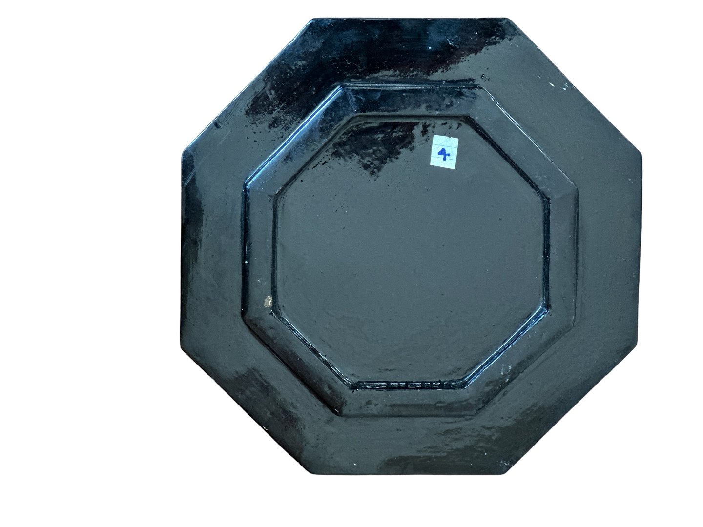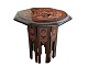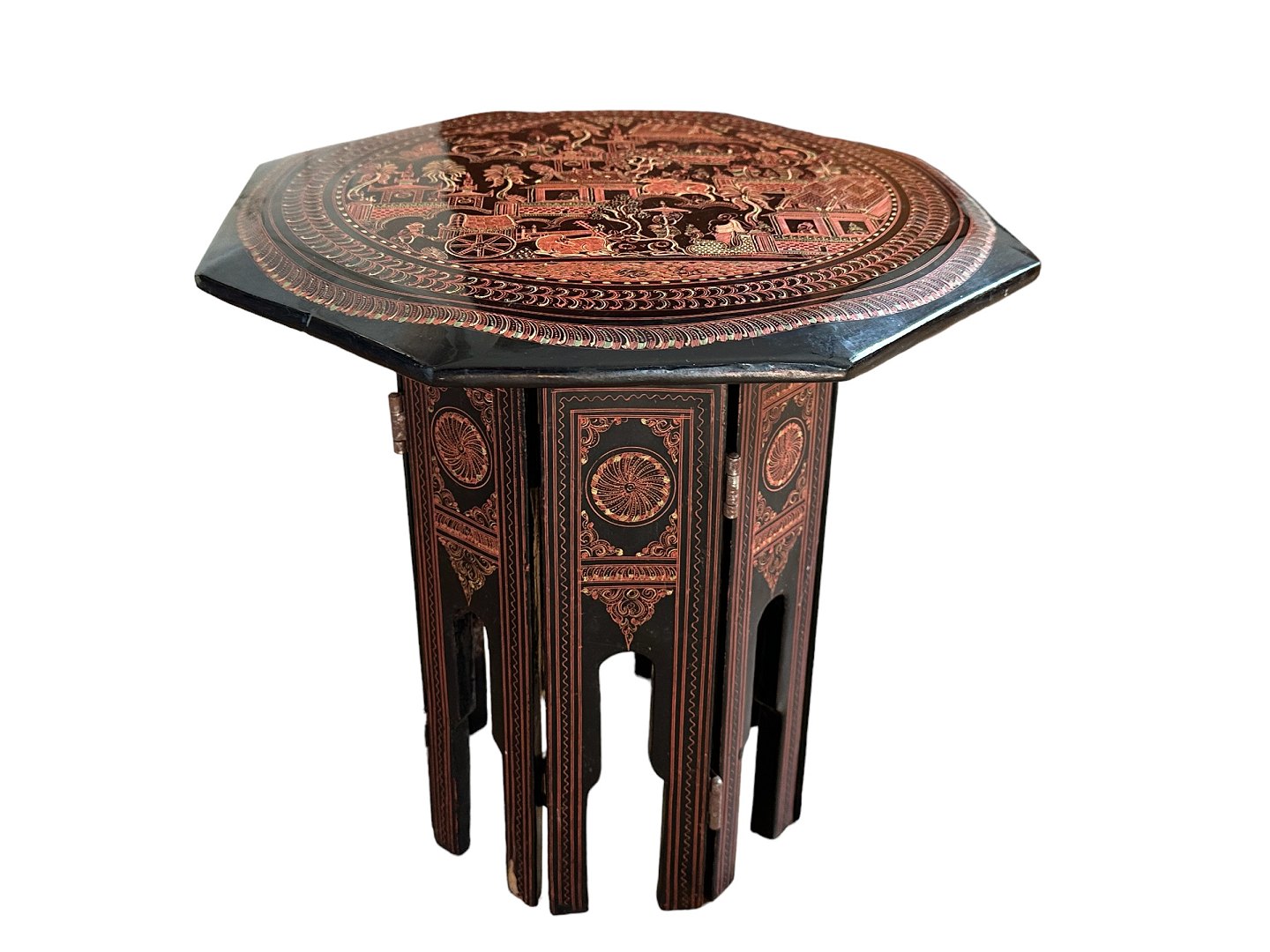 Lille ottekantet burmesisk tebord (Myanmar). Lakarbejde. Bordets stel er foldbart og pladen kan tages af. Bylivs-scener fra Burma.