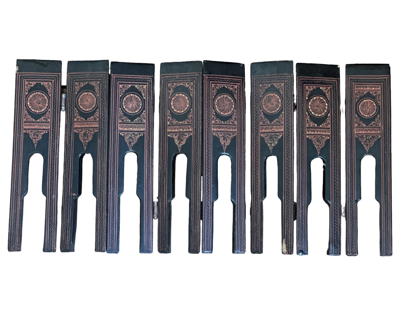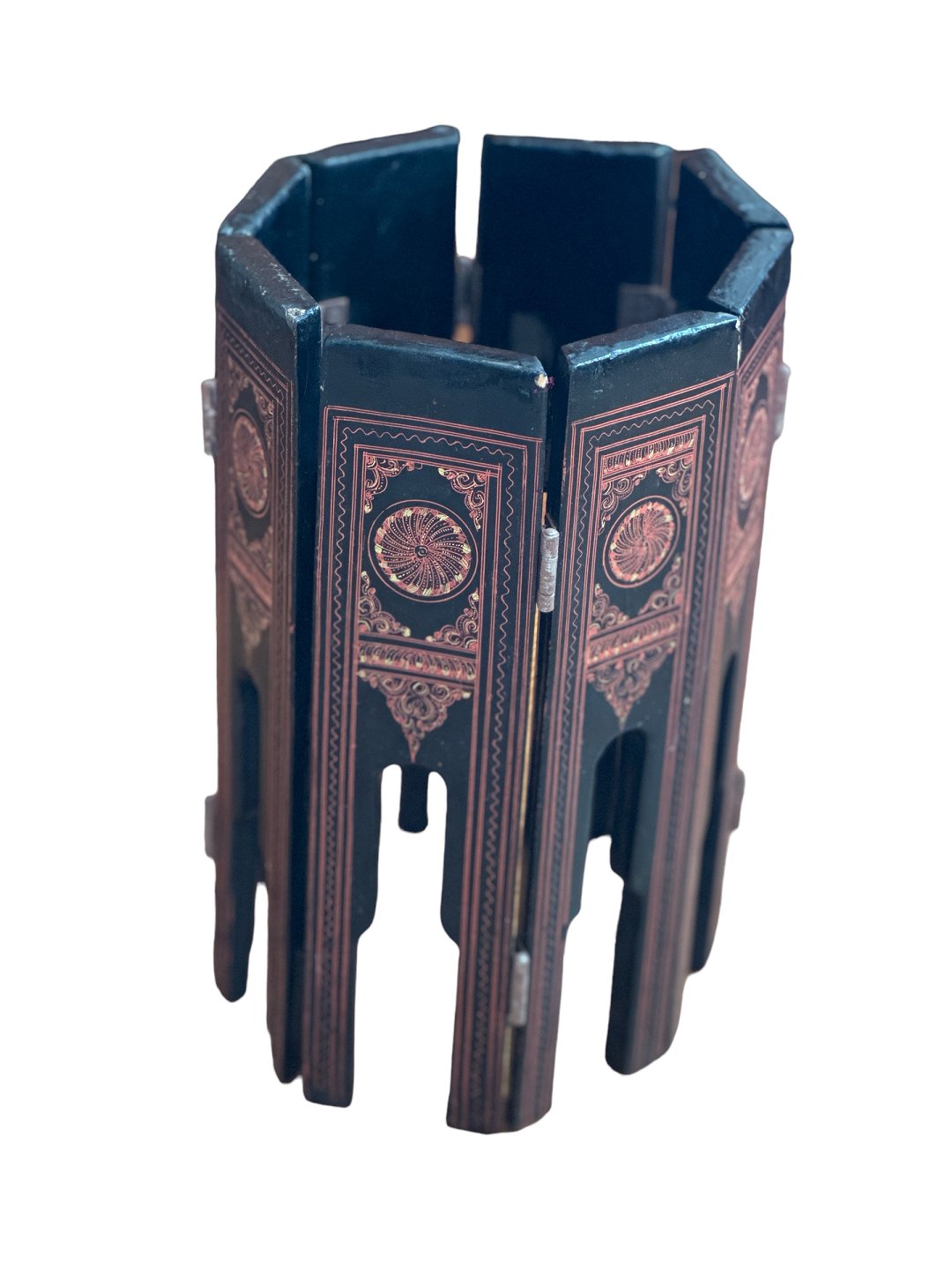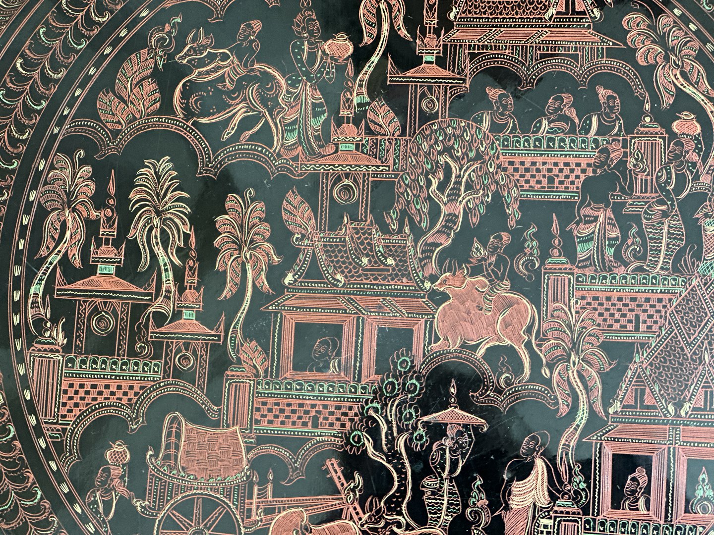 Lille ottekantet burmesisk tebord (Myanmar). Lakarbejde. Bordets stel er foldbart og pladen kan tages af. Scener fra bylivet i Burma med mennesker, palmer, kreaturer, huse, templer m.m.