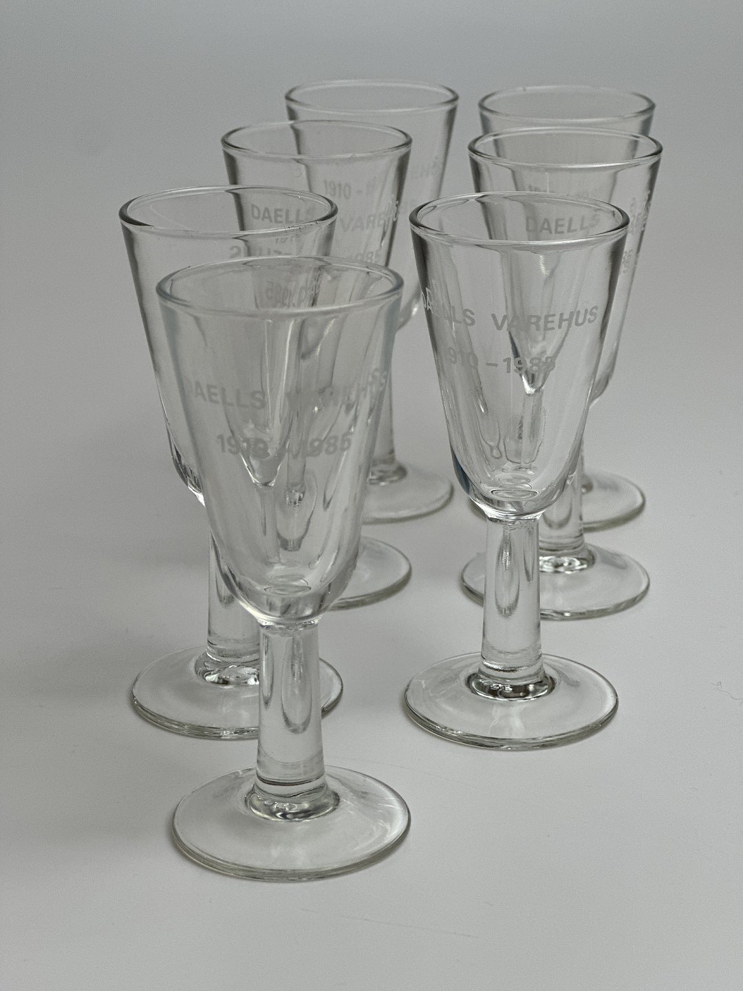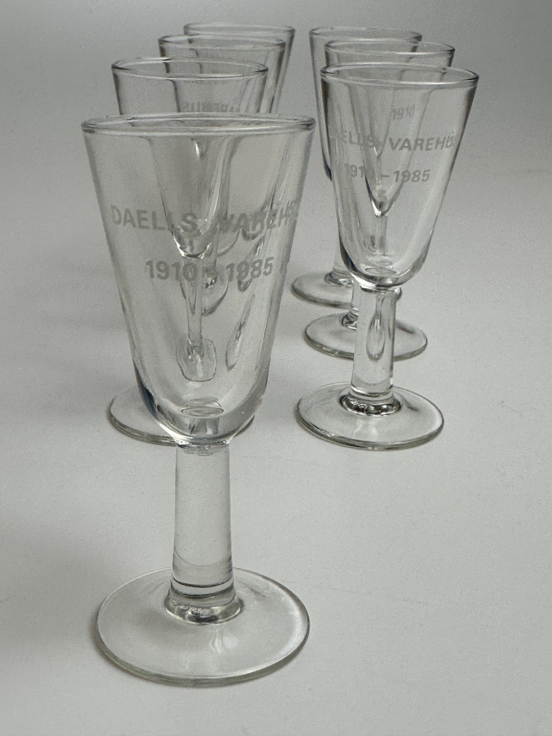 7 jubilæums snapseglas fra Daells Varehus (Dalle Valle), fra 1985. På glassene står: DAELLS VAREHUS 1910 - 1985. Memorabilia..