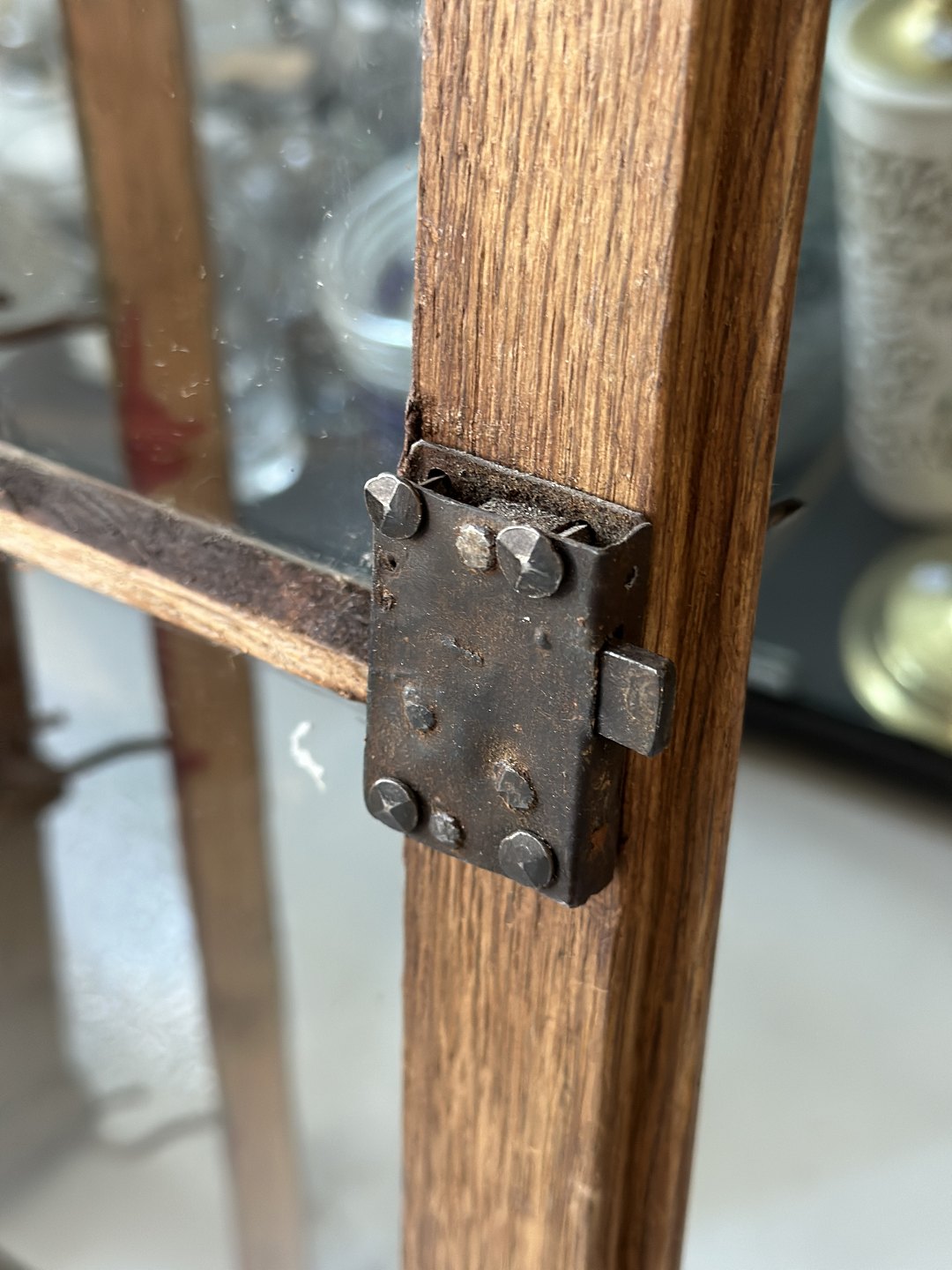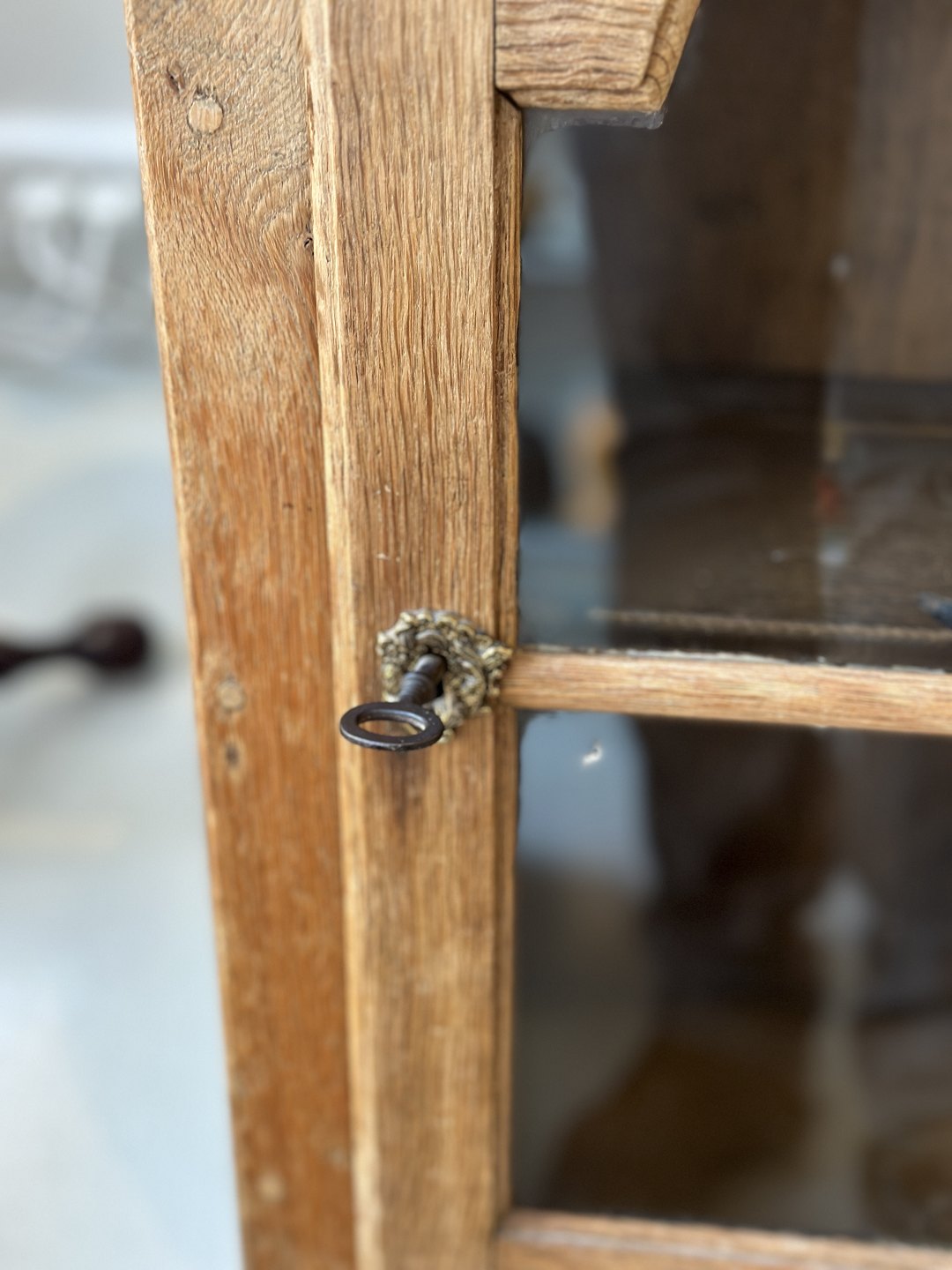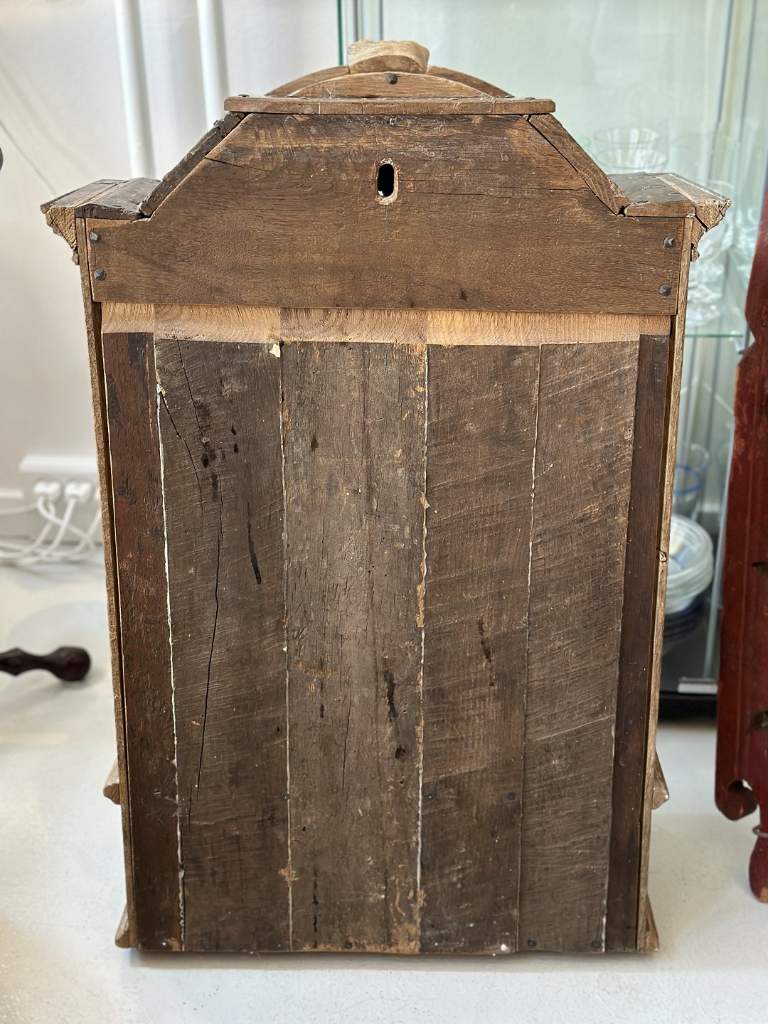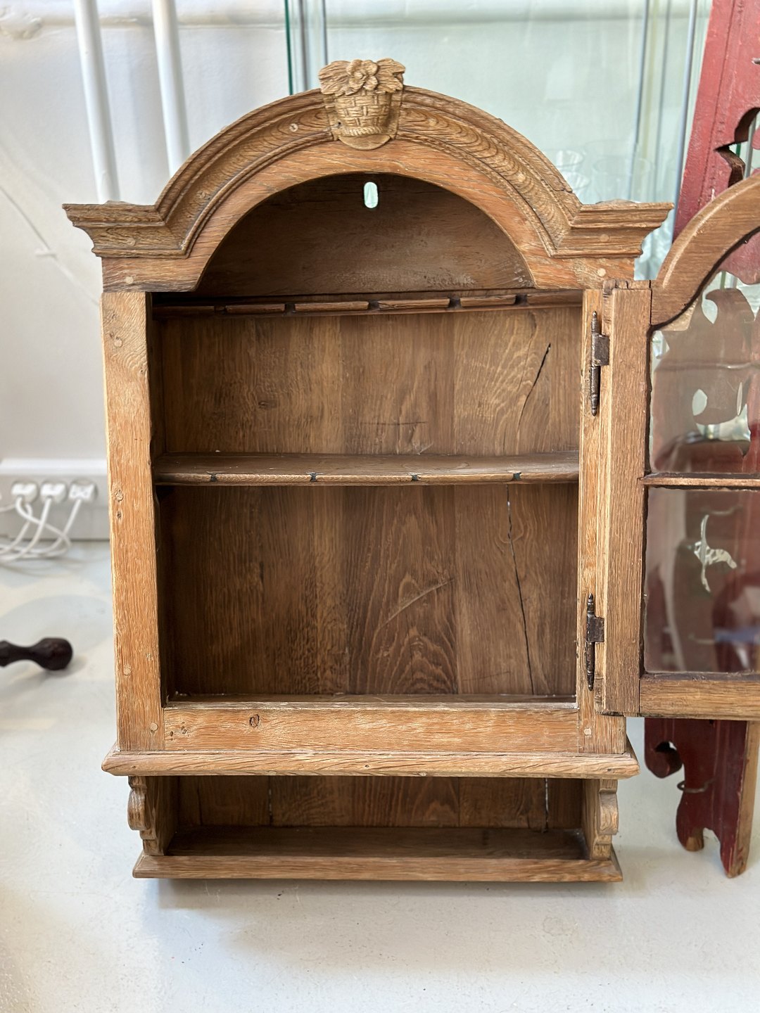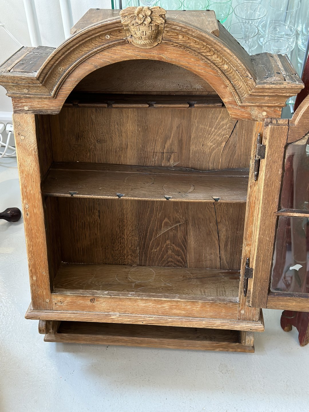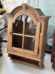 Gammel hænge vitrine i træ med buet top. Skal afhentes på Frederiksberg.