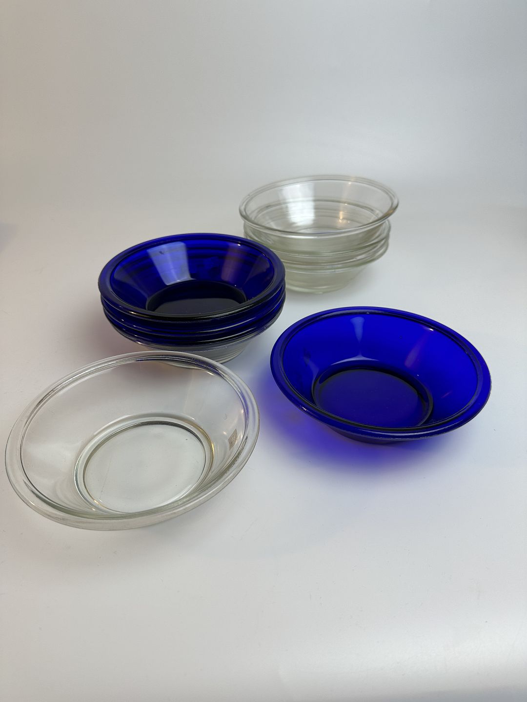 Smukke, gamle, himmelblå skåle på fod af mælkeglas