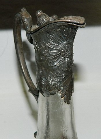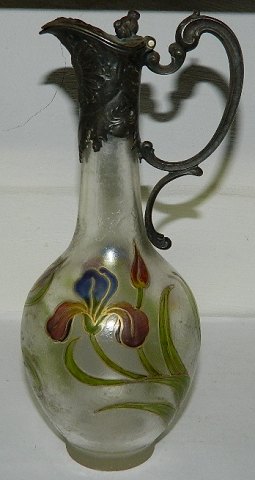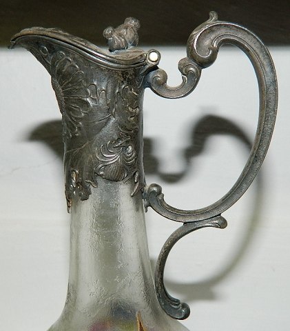 Karaffel i matteret glad med art nouveau dekoration. Top og greb i sølvplet. I god stand uden skader. Har muligvis haft en bund af metal. Kan også have stået i holder af metal. 21½ cm høj.