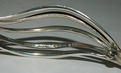Gennembrudt bladformet smykke i sterling sølv af Just Andersen. Stemplet på bagsiden. 6½ cm lang.