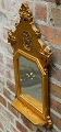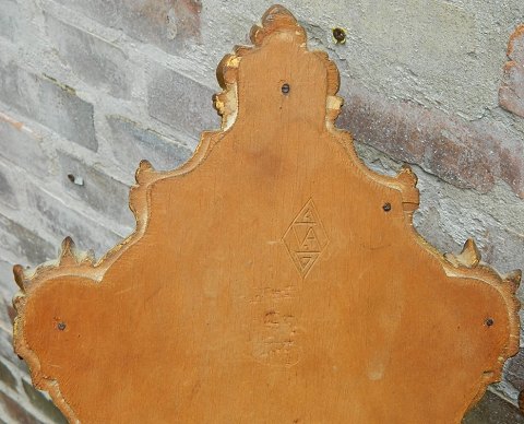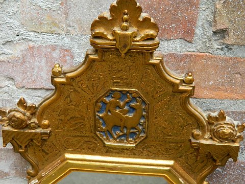 Stærkt dekoreret gildramme omkring spejl med hylde. Lille motiv med mand på hjort over spejlet. I God stand dog med slid på guldet på rammen. På bagsiden signeret enten med kunstnernavn eller fabrikslogo. 50 cm højt. Glasset måler 21 cm x 16 cm
