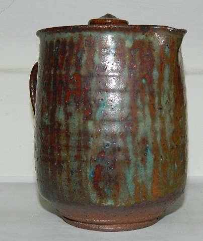 Kande med hank og låg i keramik udført af Gutte Eriksen. Fremstår i perfekt stand. Kunstnersignatur "G" under hanken. 13 cm høj.