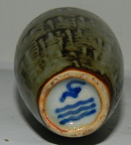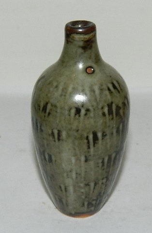 Miniature vase i stentøj fra Royal Copenhagen. Designede af Nils Thorsson. På overfladen ses en lille plet hvor glasuren mangler (fabriksfejl). Ellers i perfekt stand. Kunstnersignatur i blåt på bunden. 9 cm høj LIGNENDE KØBES