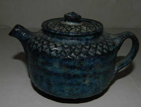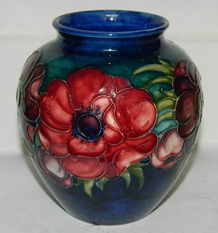 Blå vase i keramik fra Moorcroft, England. Dekoreret med blomster. I perfekt stand. Fabriksmærket på bunden. 13 cm høj.