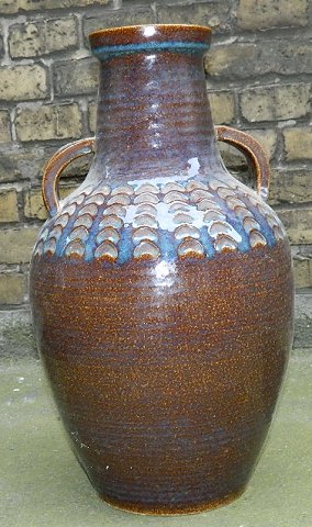 Stor krukke eller gulvvase i stentøj fra bornholmske Søholm. Udført i stil som græske lertøjskrukker, blot med klassisk dekoration samt glasurer fra Søholm fabrikken. I perfekt stand. 48 cm høj.