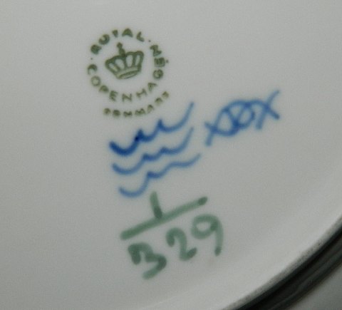 Frokosttallerken i grønt musselmalet porcelæn fra Royal Copenhagen. I perfekt stand. 1. sortering. 22 cm i diameter. LIGNENDE KØBES