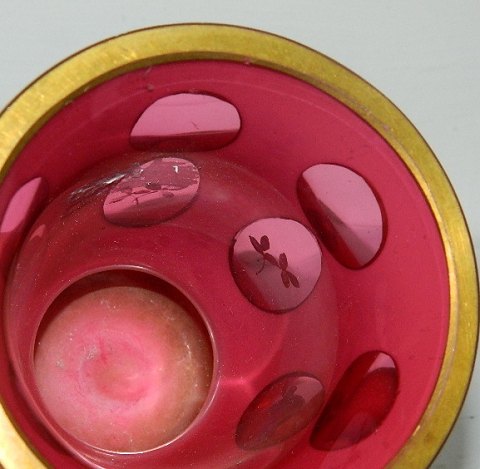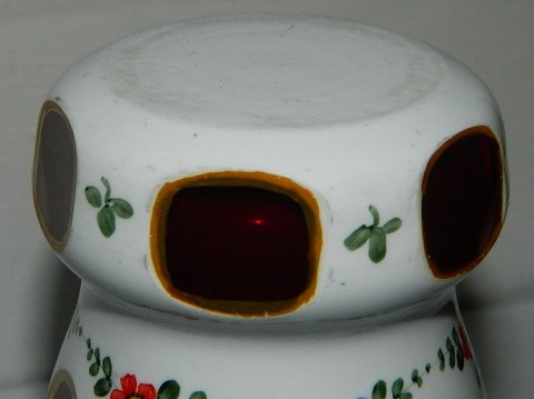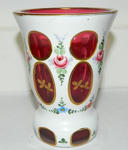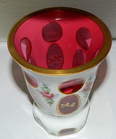 Drikkeglas fra Bøhmen. Rødt med mælkehvidt overfang. Fra ca. 1900. Dekoreret med blomster. Stort slid på undersiden, der indikerer brug gennem mange år. I perfekt stand. 12½ cm højt.