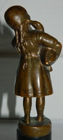 Bronzefigur af pige med gås. Formgivet af billedhuggeren Svend Lindhardt i 1940´erne. I perfekt stand. Signeret med SL på bagsiden af bronzesoklen. Højde: 10½ cm. Incl. sokkel af træ 15 cm.