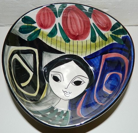 Skål i fajance fra Stavangerflint i Norge designet af Inger Waage. Dekoreret med ansigt i bunden af skålen. Fremstår i perfekt stand. Fabriksmærket på undersiden. 12½ cm høj og 21½ cm i åbningsdiameter.