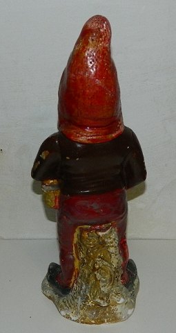 Stor gammel figur af nisse i bemalet gips. I god stand med almindeligt brugsslid. Har mindre revne på bagsiden. Fremstillet omkring 1920. Stemplet Dansk Industri ENERET. 36½ cm høj.